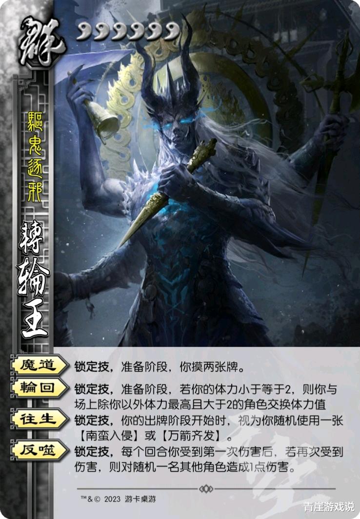 最终压轴的阎王是转轮王!他一共四个技能:【魔道】额外多摸两张牌,【轮回】是血量低于2时,和最高血量的玩家交换血量!【往生】是随机视为打出南蛮入侵或万箭齐发,【反噬】是一回合内第二次受伤时会反伤玩家。转轮王强度最高,交换血量的机制让他充满无限可能,前一秒还是玩家优势,下一秒就可能全军覆没!