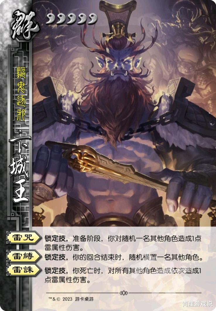 第六位阎王是卞城王,【雷咒】是随机对一名玩家造成一点雷电伤害。【雷缚】是横置一名玩家,【雷诛】是死亡时对全场玩家造成雷电伤害。卞城王主打雷电属性伤害,要注意再加上【雷缚】的铁锁连环加持,一旦卞城王死亡,全场的玩家容易全部残血!