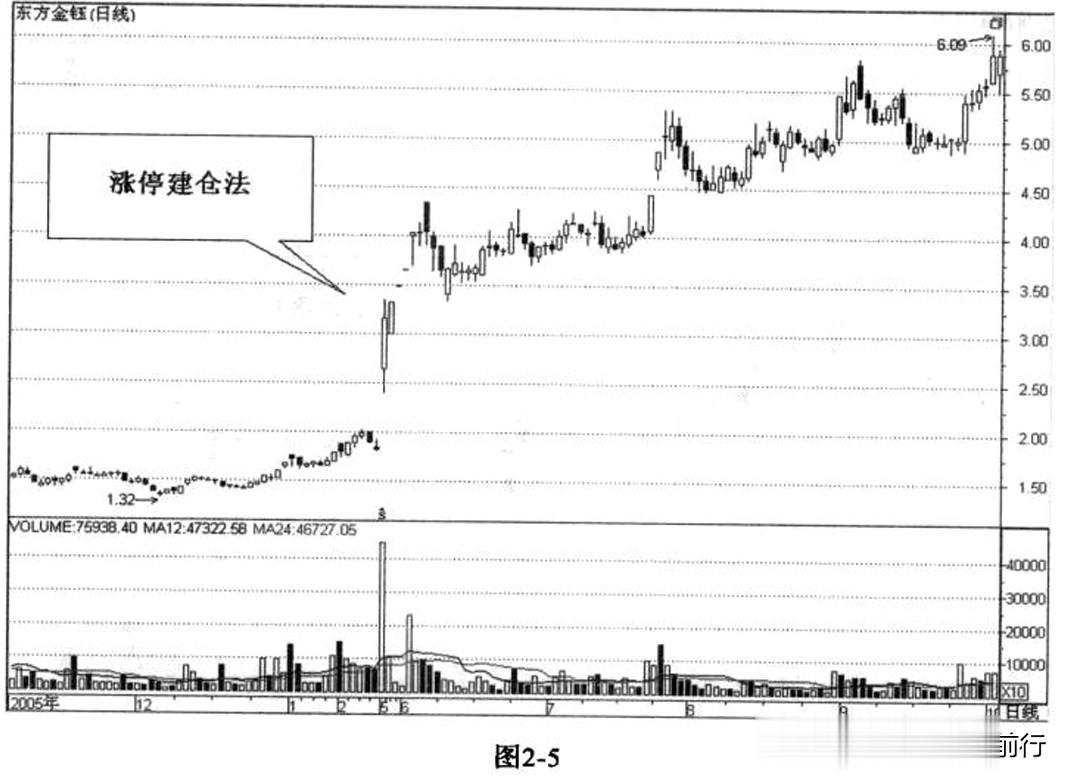 这种方法是指庄家不计成本,快速买进筹码。一般而言,在受到大盘重大利好的刺激或个股潜在重大利好公布之时,行情即将反转,庄家只有采用这种方法建仓。在K线走势上往往表现出连拉阳线,拉升趋势明显(见图2-4)。