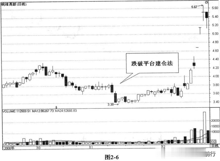 这是指庄家在底部进行较长时间的平台式建仓后,仍然没有收集到足够筹码,于是庄家便不惜成本,进行疯狂打压,击穿底部平台并创出新低,引发市场恐慌性的抛盘,而庄家则乘机吸纳大量筹码(见图2-6)。