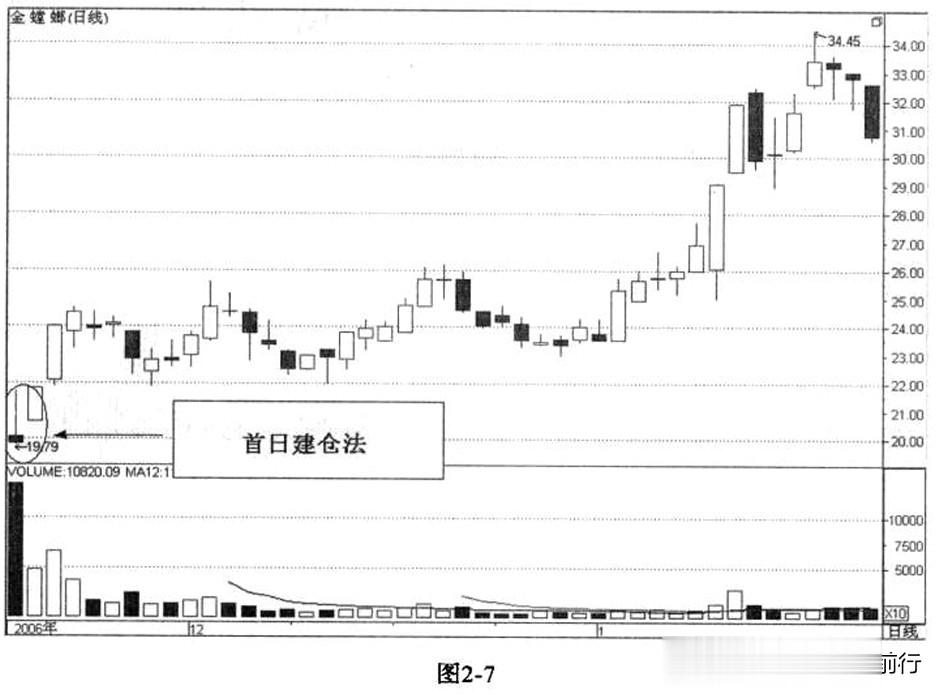 首日建仓法是指在新股上市首日大举建仓,这种方法用在中小盘的新股中较多。由于新股的持有者成本都很低,一旦价位合适就会纷纷抛售,这样庄家很容易就能吃到筹码。而新股上市首日的涨跌幅限制很宽松,成交换手极大,为庄家的快速建仓提供了条件。尤其是调整市道中,新股一般定位不高,庄家很容易收集到价廉物美的股票(见图2-7)。