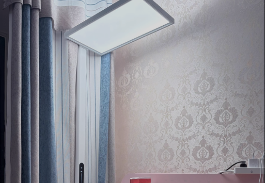 这款灯用的是首尔Sunlike紫光灯珠,采用紫光激发模式。这种发光模式的最大优势在于蓝光含量天 然偏低。紫光全光谱灯珠经过实验室临床验证,能显著减轻视觉疲劳,减慢近视的发展。这款灯采用高频调光技术,通过IEEE无频闪认证,无频闪危害。眩光方面采用环绕测发光+特制反光纸+专 业导光板+高密度微菱晶防眩板,UGR<10,0眩感,高亮不刺 眼。