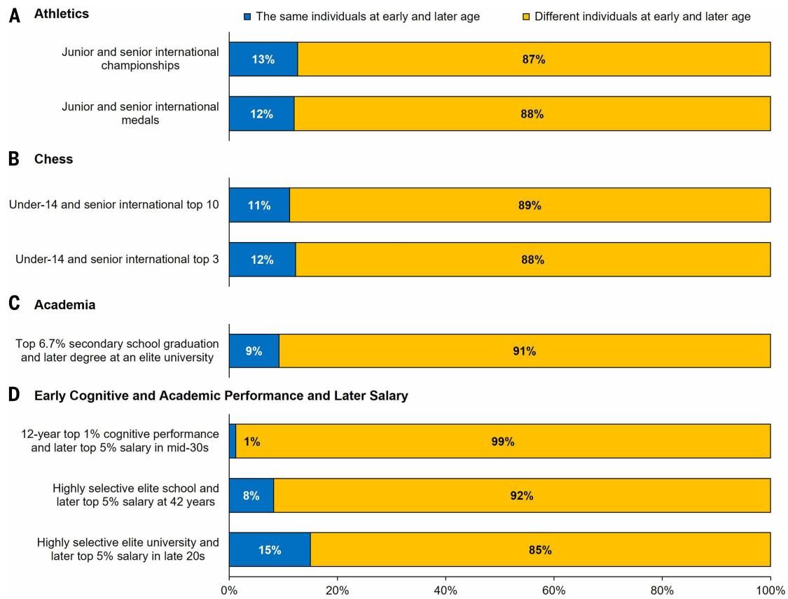 学术界:即便是在看重智商的学术领域,早期成绩最优异的学生(中学排名前6.7%),与后来毕业于顶尖名校的精英,重合度也不足 10%。