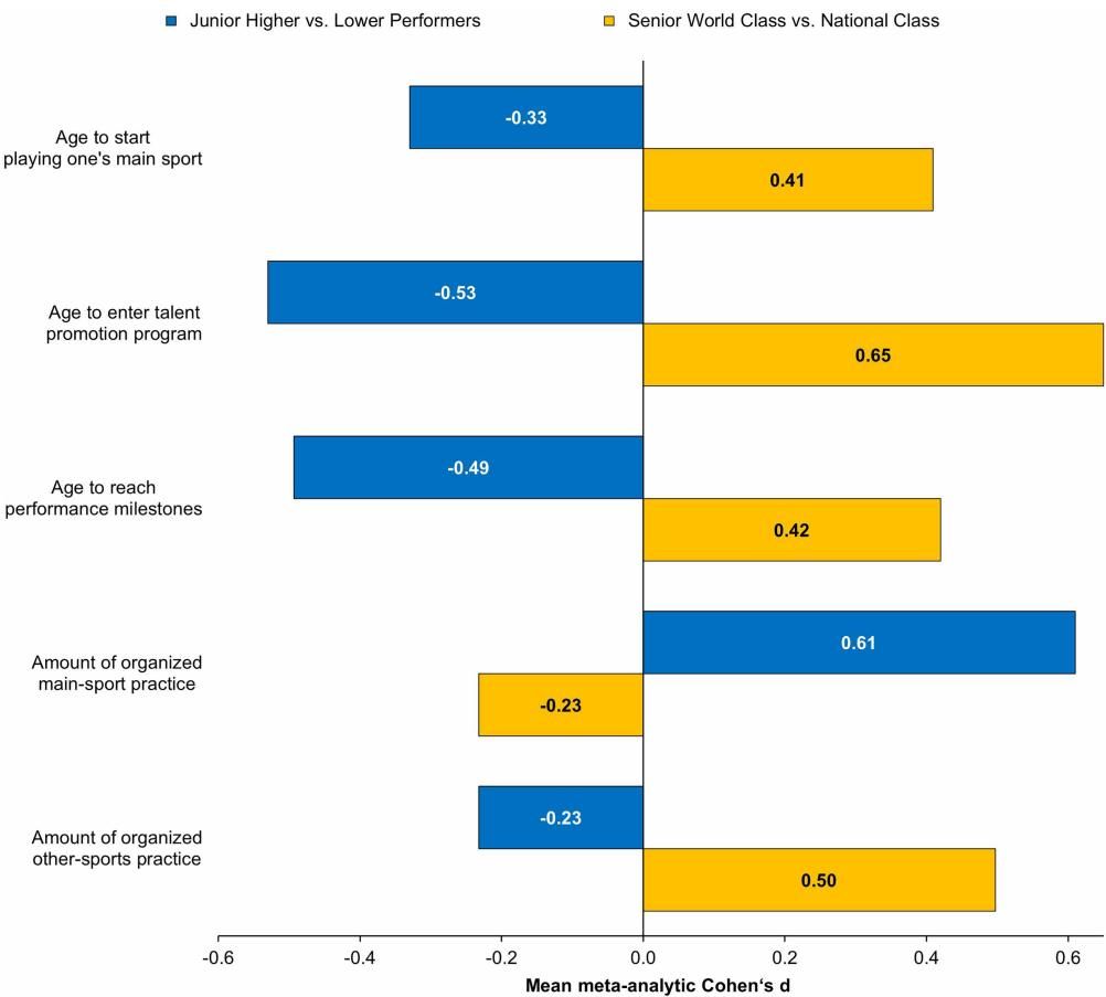 看左边的蓝色柱子:这代表了青少年时期的优胜者。他们之所以能赢在起跑线,是因为他们开始得早(更早开始专项训练)、练得多(专项训练时间长),并且更早加入人才选拔计划。