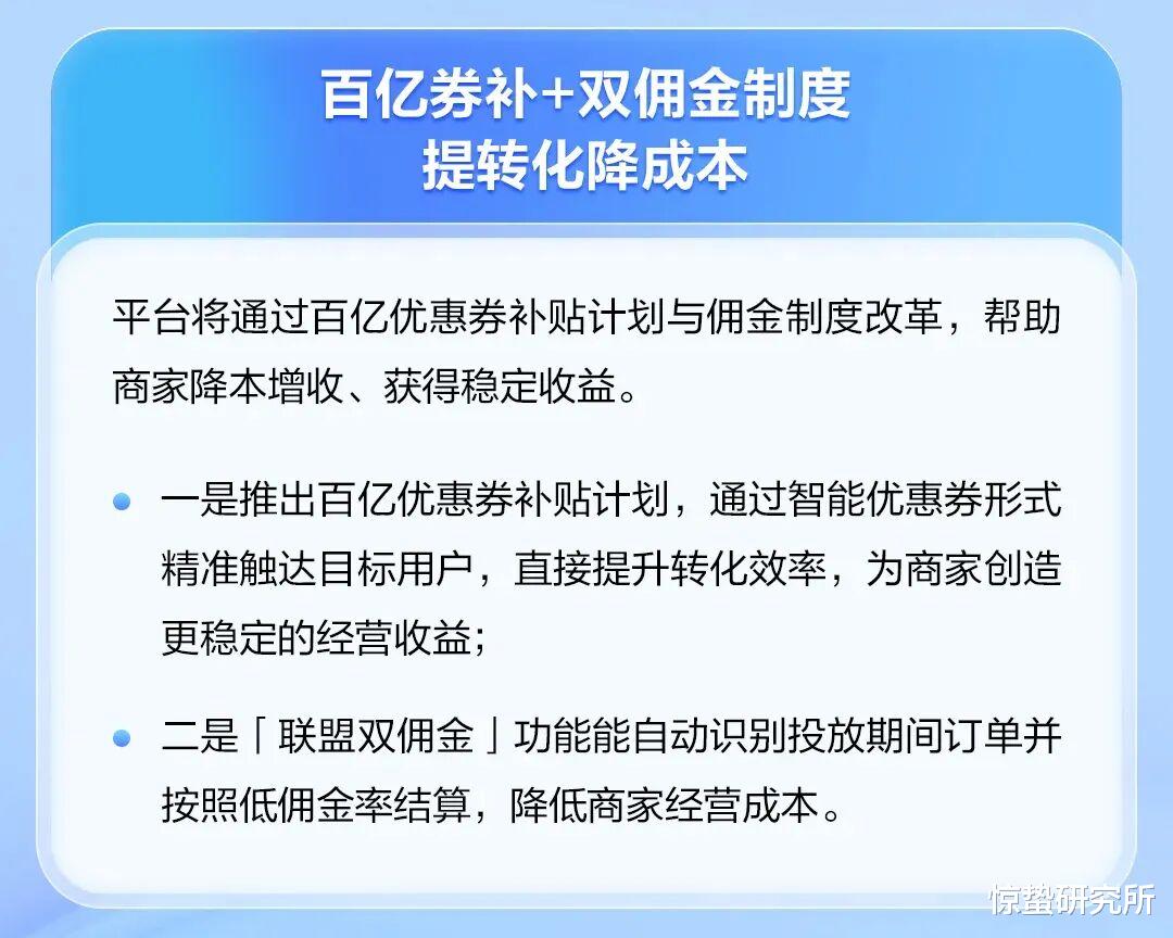 从联盟“双佣金功能”的推出可以明显看到一个趋势:平台正在借助更多技术手段帮助商家提升经营效率。而惊蛰研究所注意到,抖音电商升级后的“九大商家扶持政策”中,除了联盟“双佣金功能”,还新增了百亿智能优惠券补贴计划。通过智能优惠券帮助商家精准触达目标用户,实现转化效率的直接提升,从而带来更稳定的经营收益。