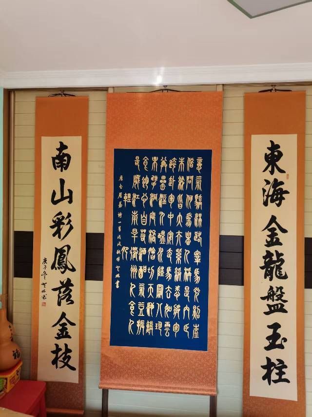 王登林简介王登林,生于1947年,自幼喜欢写毛笔字。退休以后重拾旧时爱好,师从著名书法家任政弟子李文学、周庆祥老师学习金粉字。平时刻苦努力,每天摹写八个小时以上,天长日久终于攻克了金粉篆书。2013年获首届上海市民文化节入围奖,2014年又获上海市篆隶书法入围奖。还获得上海中华书画协会第二十四届“文明杯”金奖、上海中华书画协会第二十五届“造币杯”一等奖、上海国际书画摄影大赛金奖。历练让金粉书家王登林先生拥有了一双发现美的眼睛,在他“豪华靓丽之品,道骨仙风之相”书法作品中诠释无遗,赢得了业内人士的诸多好评,影响深远,市书协主席宜家鑫看了先生金粉篆书后给予了一绝的高度评价。王登林先后加入上海中华书画协会、平凉街道书画会、红商事清韵杨浦画院、静安区书法协会,和市书协老龄委。现为上海书法家协会会员。