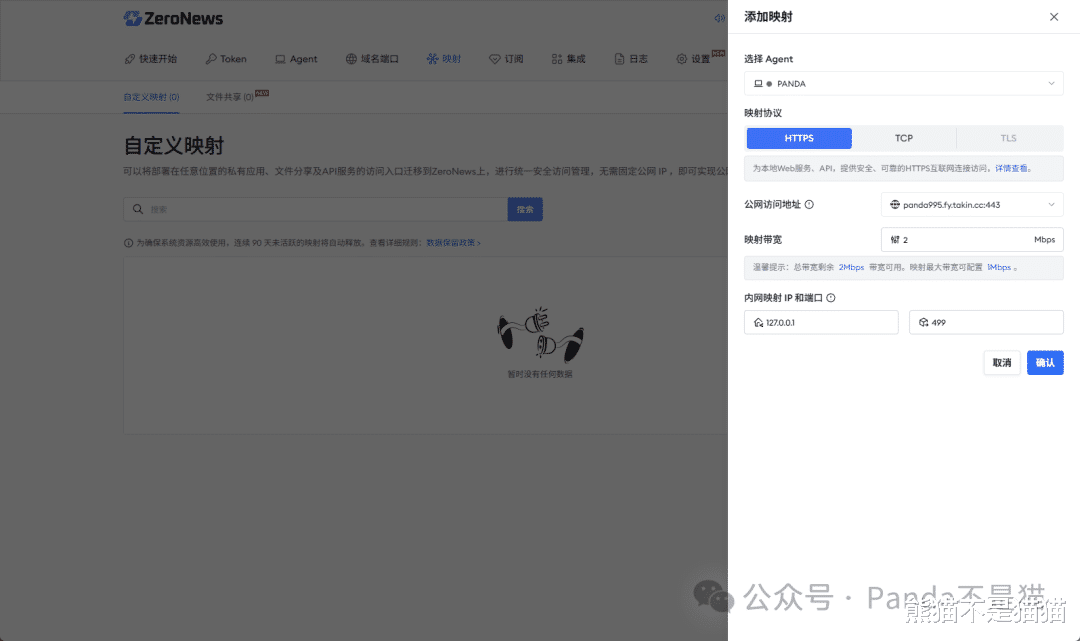 设置也非常简单,比如我想映射部署在绿联 NAS 里的 lucky 服务,选 HTTPS 协议,公网地址由 ZeroNews 提供,前缀名称能自己改。免费用户映射的带宽速度最大是 2Mbps,最后填上内网服务的端口就行。