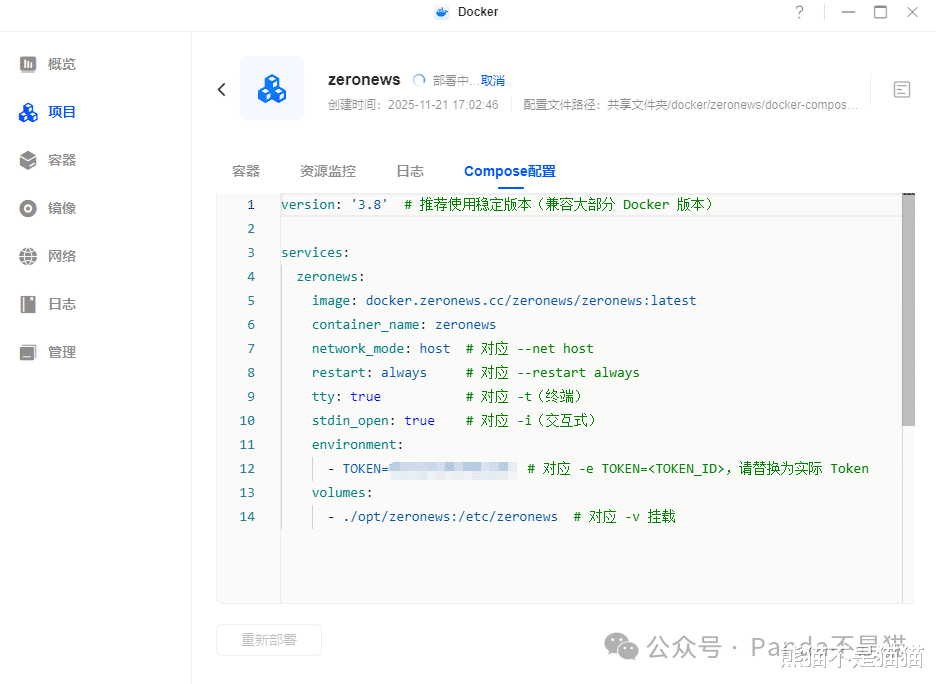 部署方面,这里熊猫以绿联的NAS为例,毕竟官方貌似没有对应的绿联NAS部署过程。我们打开绿联的Docker,在项目中新建输入以下代码,其中的TOKEN记得替换成自己的: