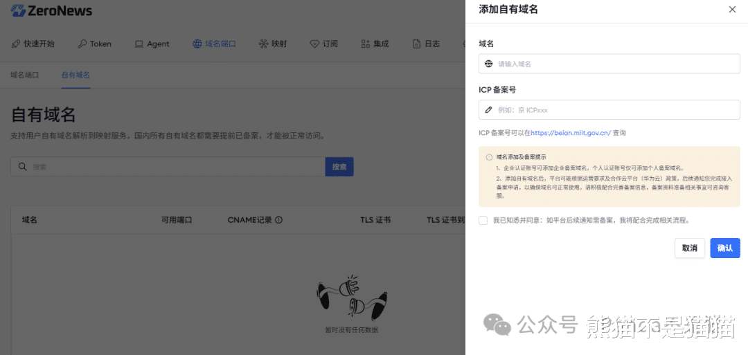 除了 ZeroNews 提供的域名,如果你有自有域名也可以直接用自由域名进行映射,毕竟自有域名作为一级域名还是更好记一点,不过域名一定要进行备案。