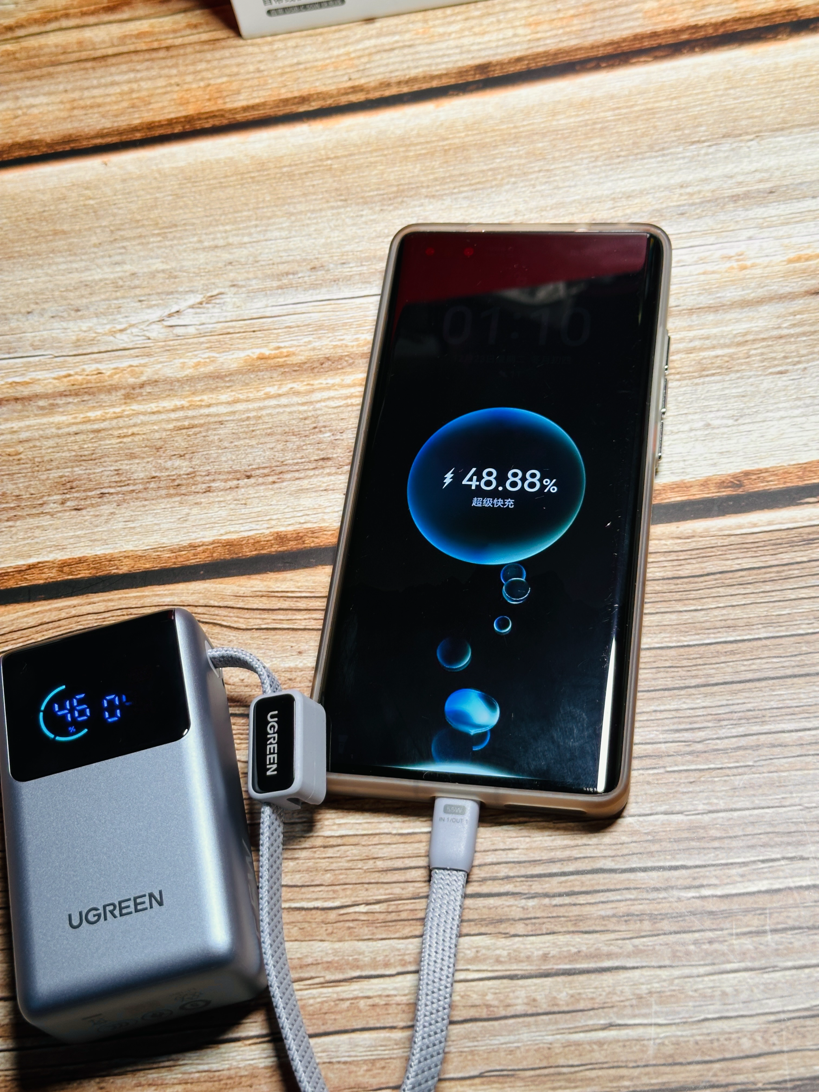 充电速度是核心竞争力,实测数据如下:自带Type-C线充华为Mate 40 Pro,20%-80%仅32分钟,功率稳定45W左右;自带苹果线充iPhone 15,20%-80%耗时48分钟,功率20W(符合苹果快充协议);充小米Pad 6,30分钟可从30%充至65%,满足应急需求。