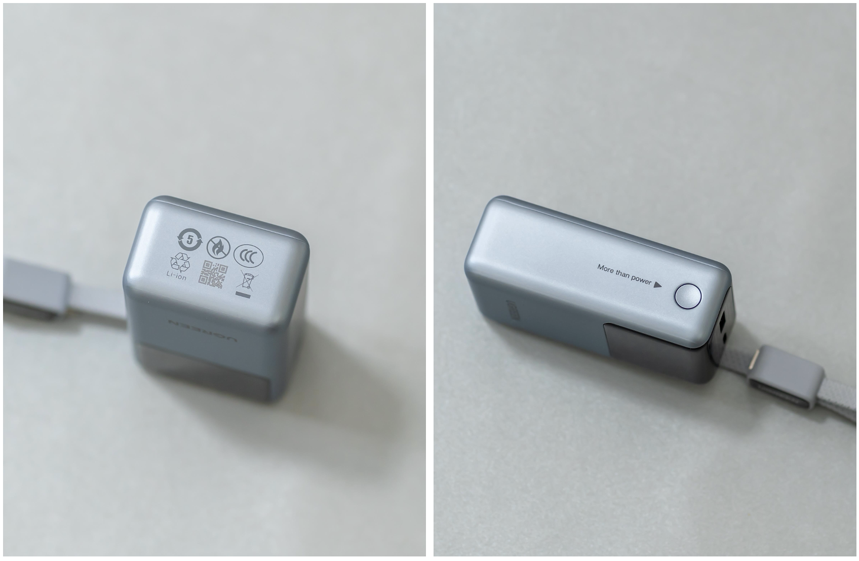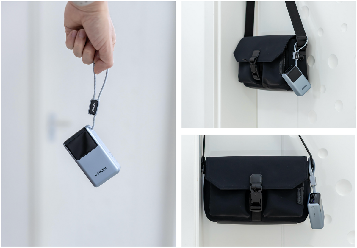 充电宝自带一根苹果同款编织工艺的快充线(C口),强韧耐用,官方宣传经得起10000+ 次弯折,可以放心使用。最妙的是这根线平时收纳起来就是一个活扣挂绳。出门时手指一勾就能拎着走,或者挂在背包上,非常方便。