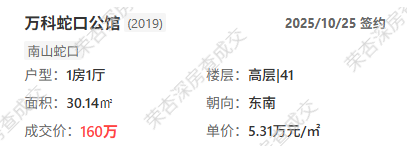 比如南山的「万科蛇口公馆」,30平公寓在今年2月成交155万,10月成交160万,价格不仅稳住了,甚至还横盘微涨。