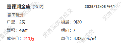 再看福田的「嘉葆润金座」,48平公寓最新成交价210万,租金回报率4%。