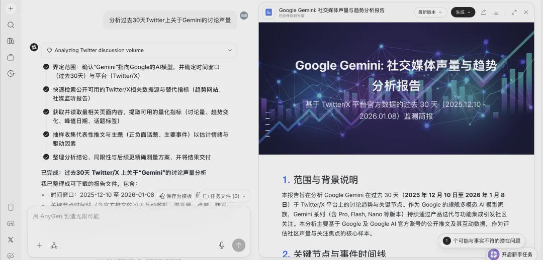 以“数据调研报告”为例。当输入“分析过去30天Twitter上关于Gemini的讨论声量”时,AnyGen并不是简单地调用大模型生成一段似是而非的评论,而是内置了一个类似爬虫的Agent去实时抓取数据。