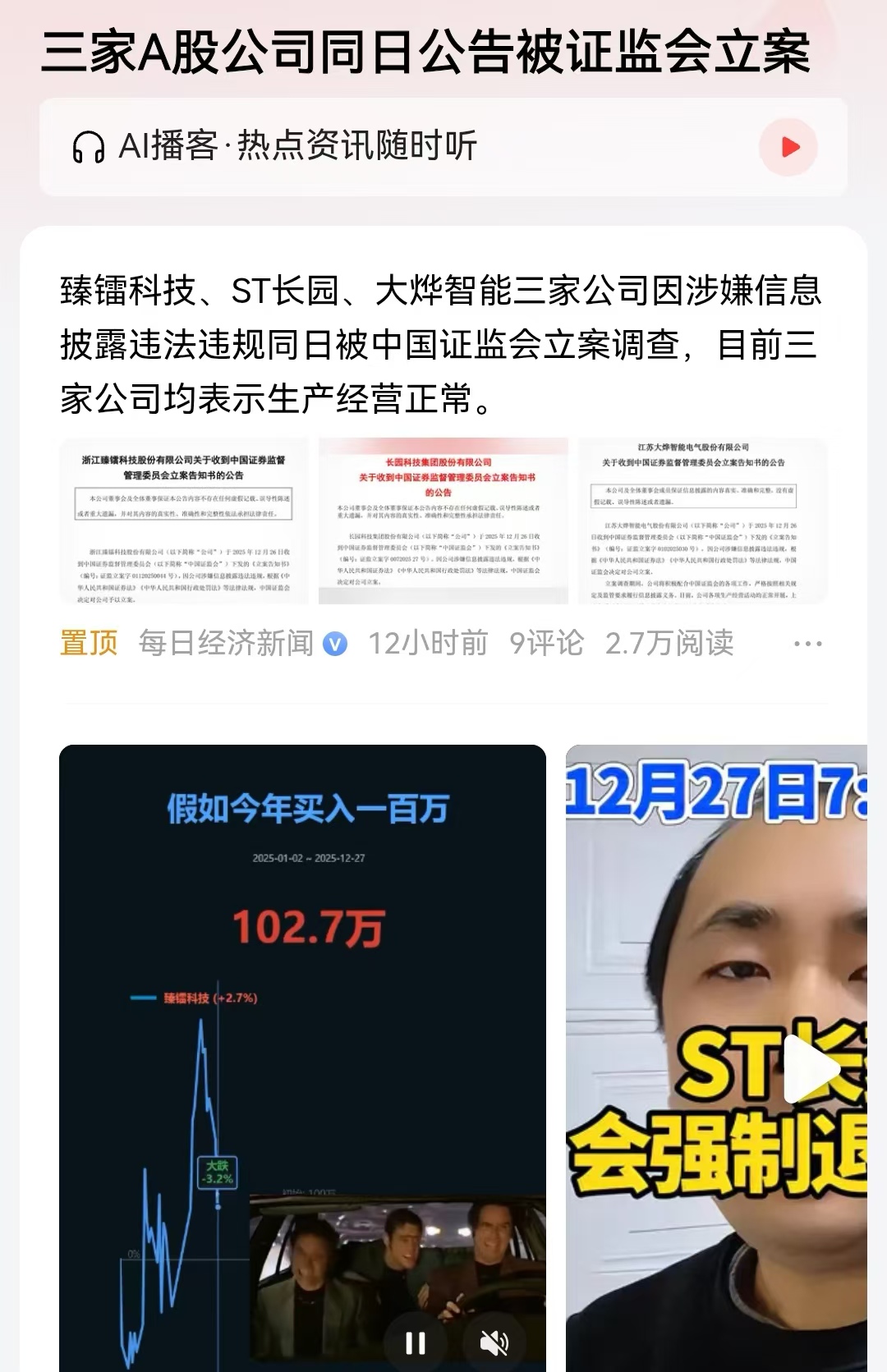 在2025年最后几天,监管同时对三家上市公司立案调查。目前从公告来看,臻镭科技、ST长园、大烨智能三家公司仅仅告知涉嫌信息披露违法违规。那么具体是关联交易没有披露,还是重大财务数据被隐藏,又或者大股东相关信息有隐瞒造假行为,现在还不清楚,但是无论如何,对于持有这三家上市公司的A股股民来说,都是一个极大的利空消息。
