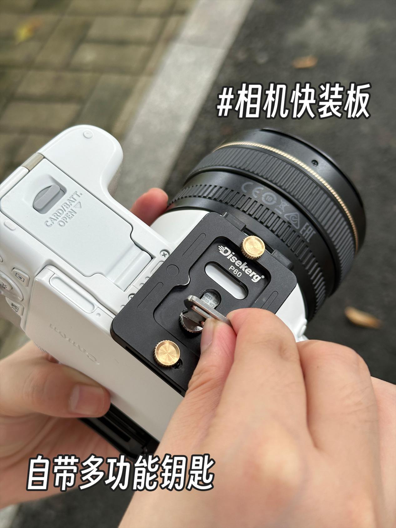 快装板基本上都是与三脚架配合使用,可以快速地将相机安装到三脚架上,这样就可以轻松地拆卸相机了。并且这款快装板还能自带多功能钥匙,出门安装再也不用手拧了。