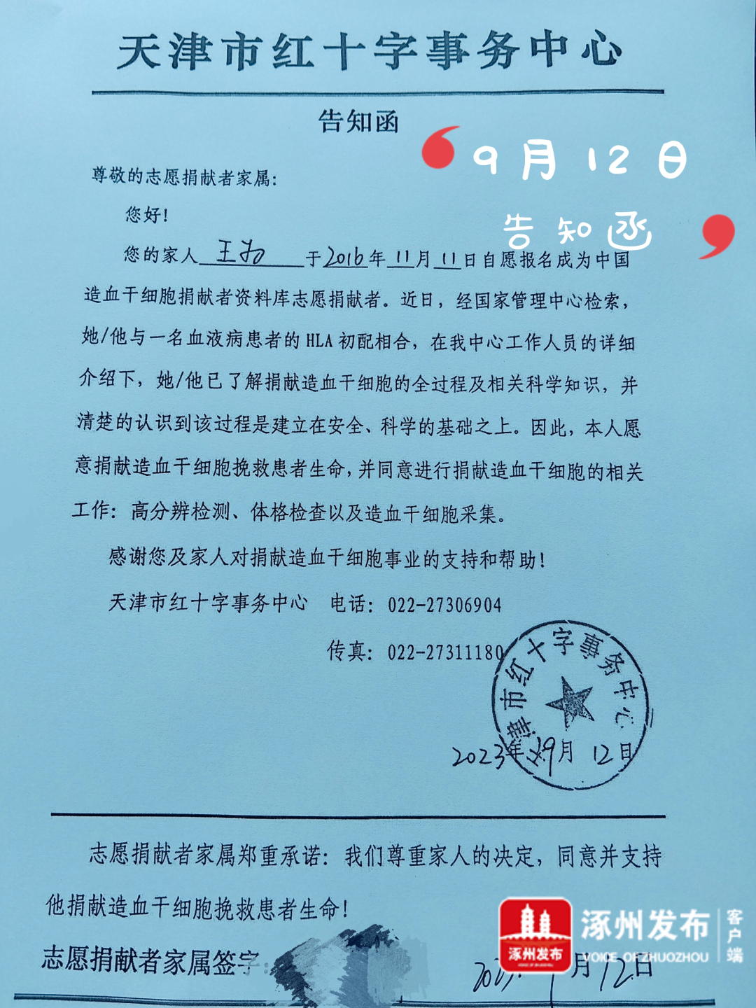 2016年11月11日就已经做好准备的王为,在时隔七年的2023年9月12日,接到了初筛配型成功的消息。河北省红十字会工作人员给王为打电话,问她愿不愿意进行高分辨检测和之后的一系列体检,她说愿意,十万分之一概率是很小的,她觉得她们匹配上就很有缘分。
