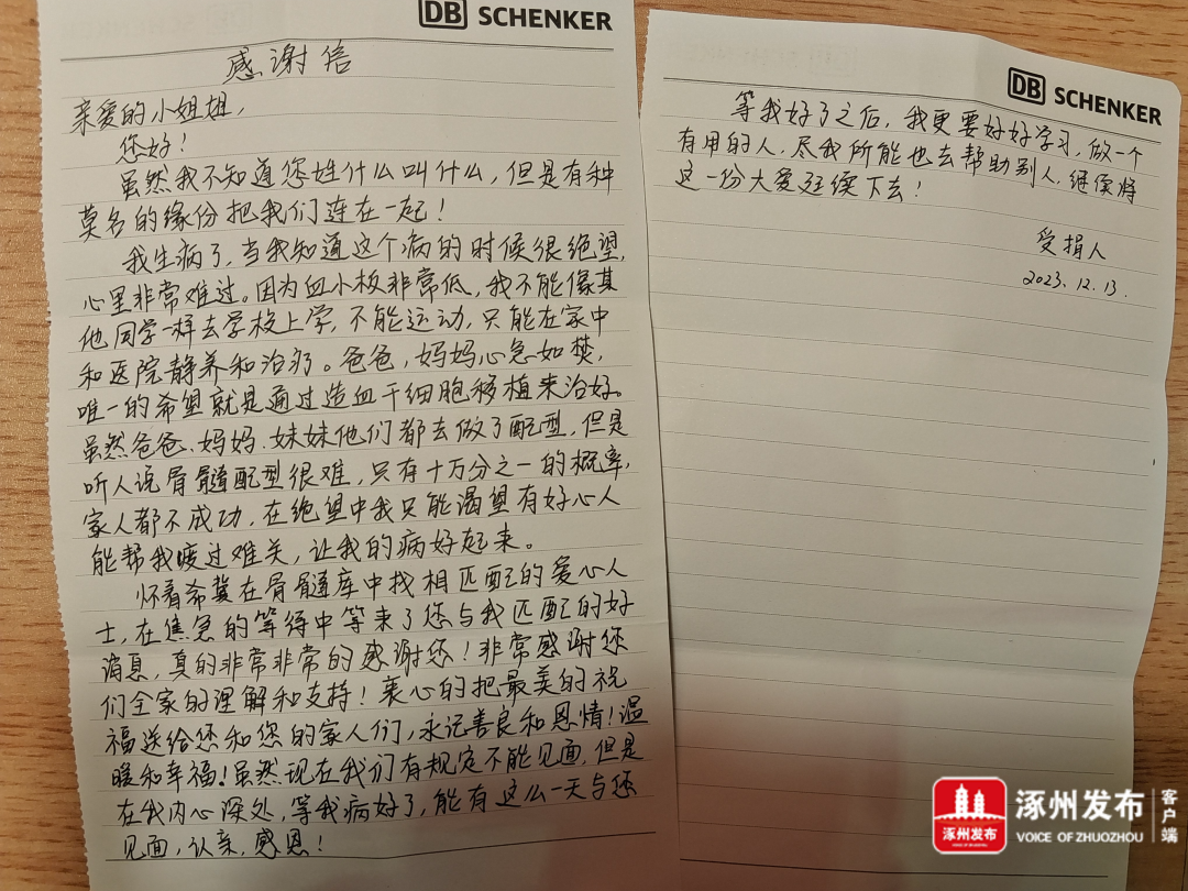 感谢信上写到:“听说配型很难,只有十万分之一的概率。家人都没能匹配成功,但在焦急的等待中,我等来了您与我匹配的好消息。真的非常非常感谢您……等我好了,我也要尽我所能去帮助别人,继续将这份大爱延续下去。”
