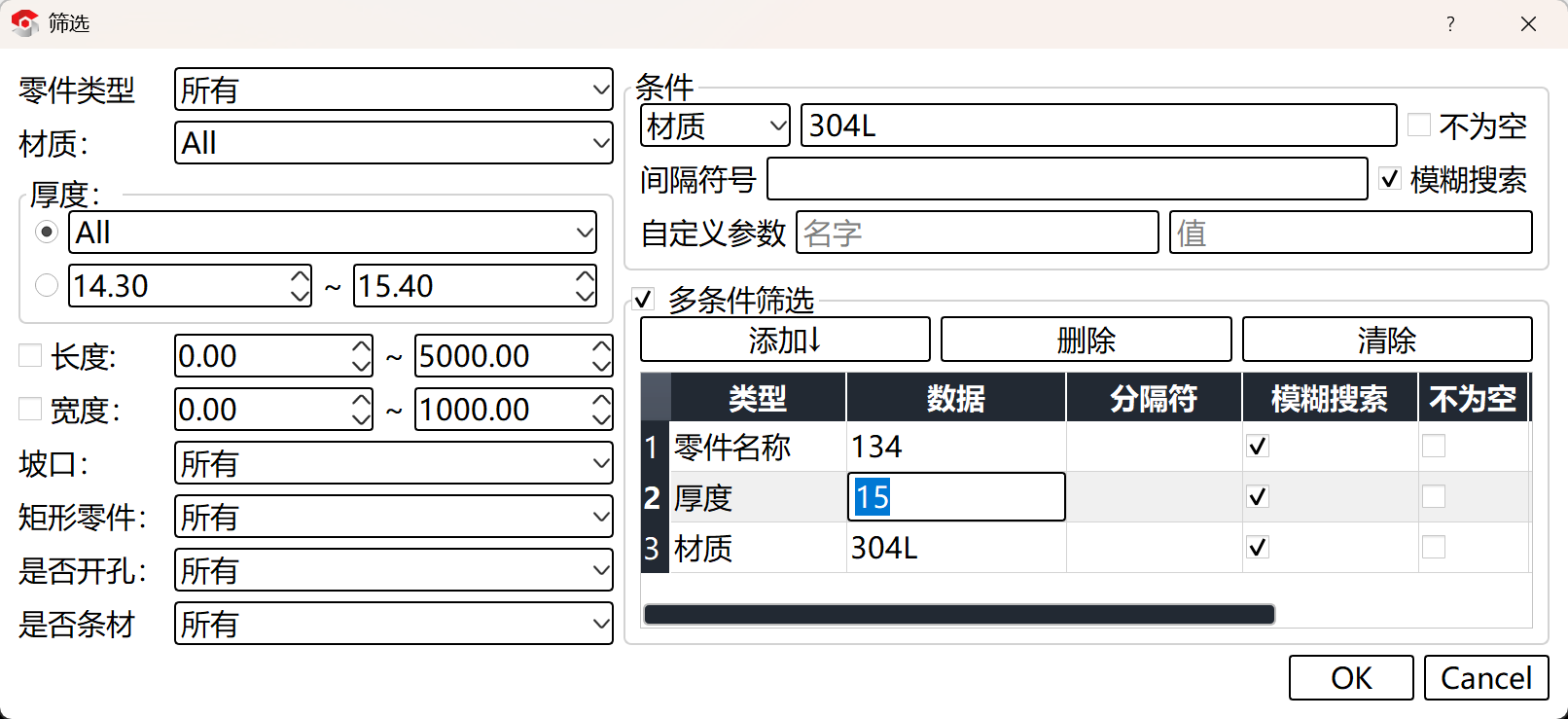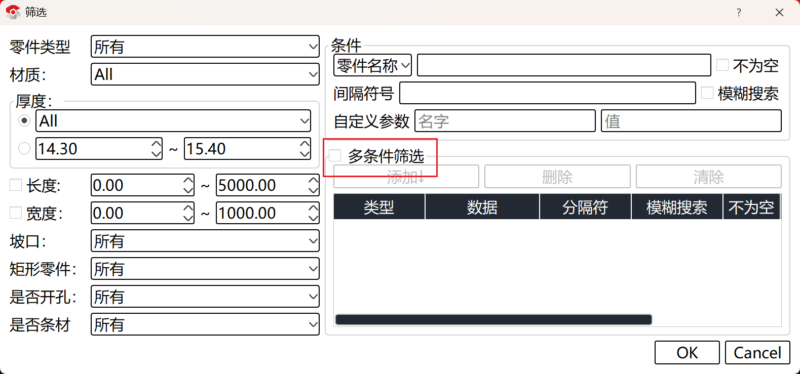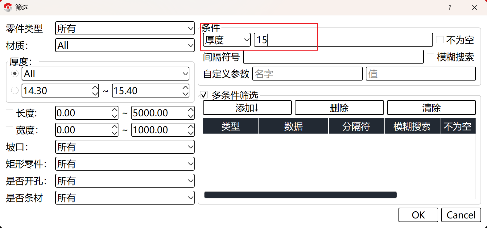 但是在筛选过程中可能会有部分零件也满足我们的需求,但并不是我们想排版的零件,这个时候我们就可以进行多条件筛选,进一步快速选中目标零件。