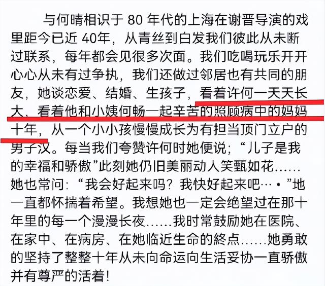 要我说,何晴这一辈子没白活,演 了那么多让人忘不掉的角色,还有个这么孝顺的儿子,虽然走得早,可她的样子、她的故事,会一直留在喜欢她的人心里。许何要好好的,妈妈肯定在天上 看着呢