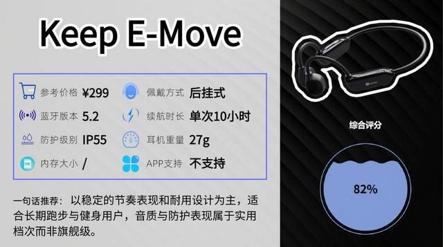 适合跑步、马拉松训练、户外慢跑与健身房使用,尤其适合长时间运动场景。10小时续航能覆盖一次完整全马训练,中途不需要补电。IP55防护能抵抗汗水和小雨,但不适用于游泳等深水环境。蓝牙5.2稳定性不错,而连接Keep App时,可以跟随课程节奏训练,是它区别于其他骨传导的独特体验点。整体来看,E-Move更像一个长期陪跑工具,功能不堆叠,但扎实耐用,对常运动的人更实用。
