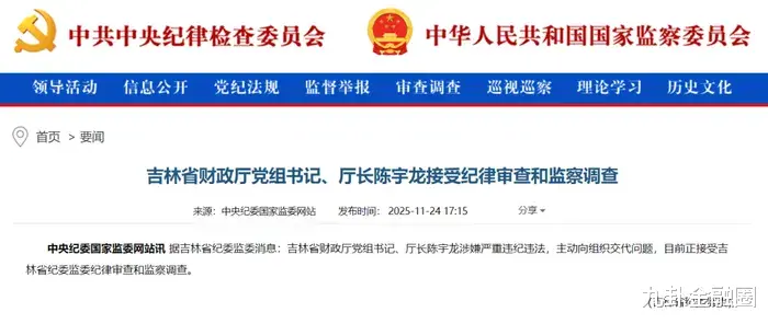 11月24日,据吉林省纪委监委消息:吉林省财政厅党组书记、厅长陈宇龙涉嫌严重违纪违法,主动向组织交代问题,目前正接受吉林省纪委监委纪律审查和监察调查。