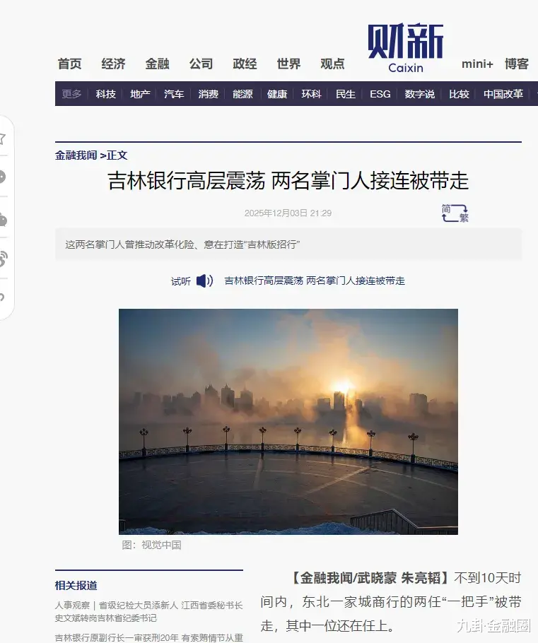 据财新最新报道,不到十天内,吉林银行两任“一把手”被带走。就在11月24日,吉林银行原董事长陈宇龙主动向组织交代问题,目前正接受吉林省纪委监委纪律审查和监察调查。财新消息称,吉林银行现任董事长秦季章也被带走留置。
