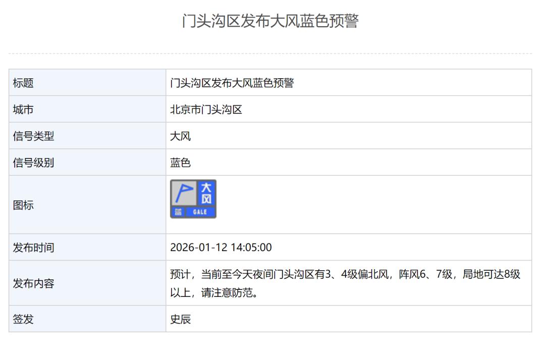 2026年1月12日14时05分,门头沟区发布大风蓝色预警:预计,当前至今天夜间门头沟区有3、4级偏北风,阵风6、7级,局地可达8级以上,请注意防范。
