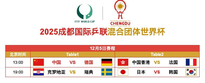 2025成都国际乒联混合团体世界杯丨12月5日全日赛程13:00 T1中国VS德国