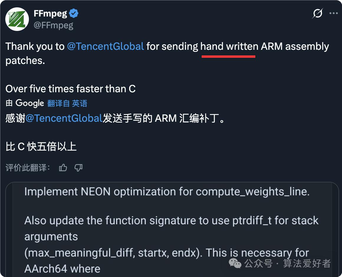 另一边是 FFmpeg 官方在1月6日公开感谢腾讯提交手写 ARM 汇编补丁,最初说“比C快5倍”,随后腾讯在 1 月 7 日又出来把数据改成“约 2 倍”,还特意强调准确性。