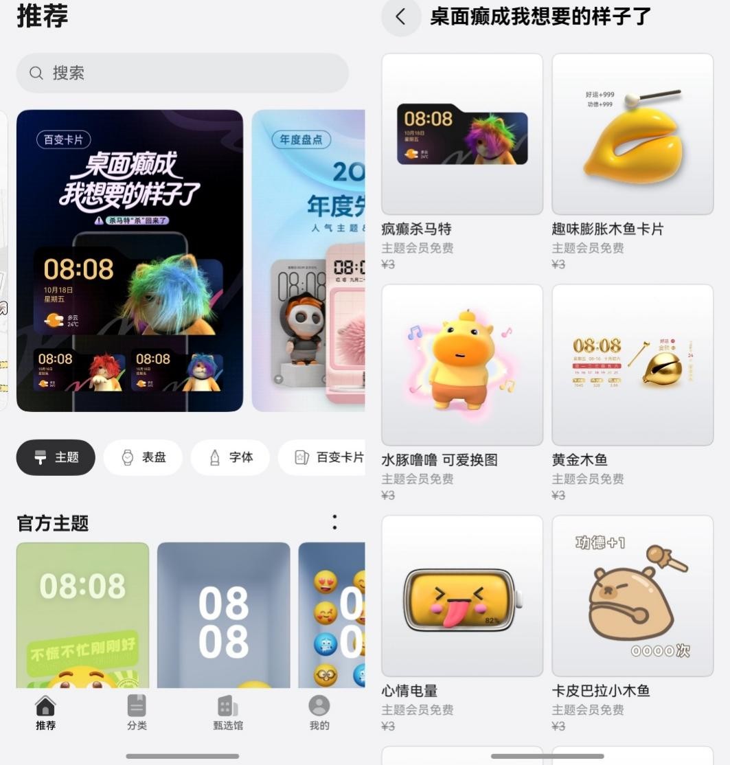 有了华为主题会员,各种脑洞大开的百变卡片都能免费体验。像《趣味膨胀木鱼》卡片,主打一个“赛博积功德”,点木鱼就“好运值+1”。还有现在超火的卡皮巴拉,点卡片能换背景和心情文字……把这些卡片组合搭配,整个桌面都活了起来,比单纯换壁纸有意思多了。