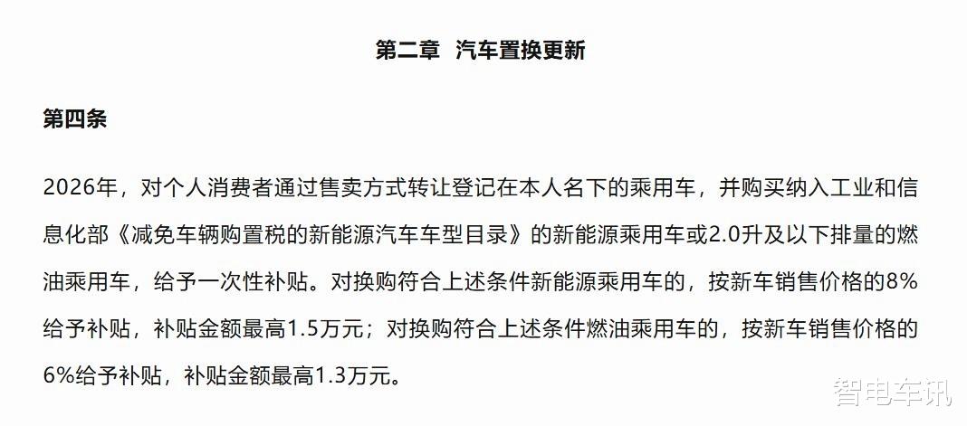汽车置换更新方面,消费者转让符合条件的旧车购买新能源车,可获得新车价格8%的补贴,最高1.5万元;换购燃油车的补贴比例为6%,最高1.3万元。