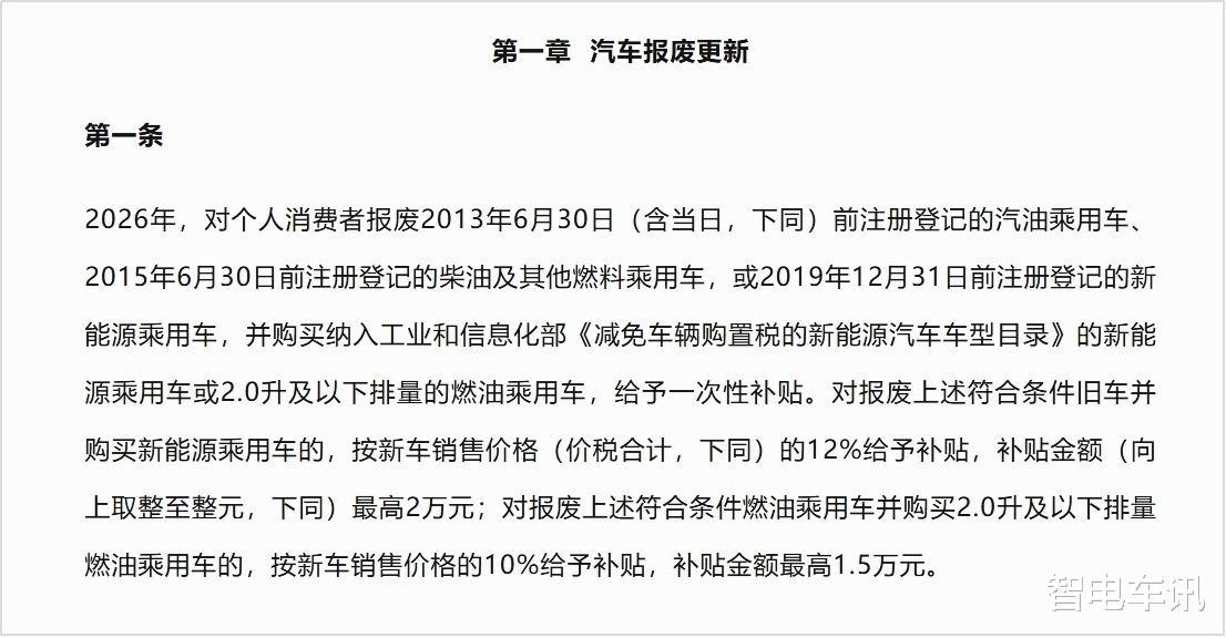 汽车报废更新方面,报废符合条件的旧车购买新能源乘用车,可获得新车价格12%的补贴,最高不超过2万元。同样条件下,购买2.0升及以下排量燃油车,补贴比例为10%,最高1.5万元。