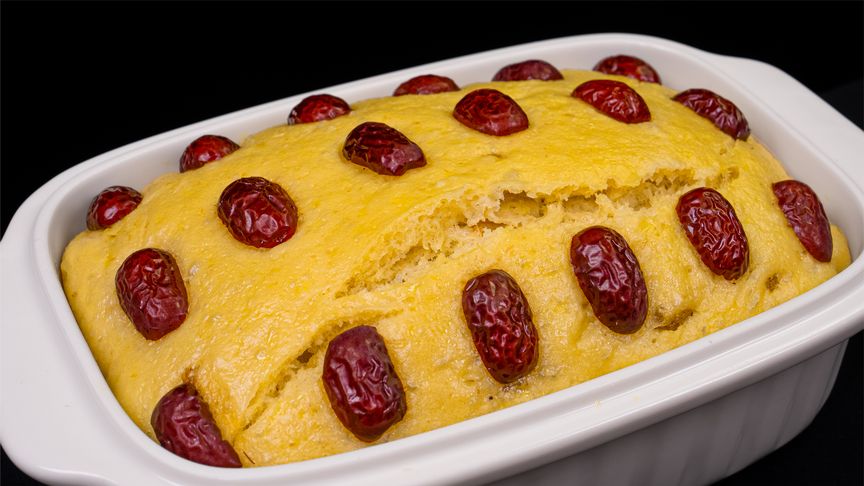 如果你想缩短醒发的时间,可以把锅里的水加热到微热的状态,水温一定不要太高,不然醒发不起来。时间到了以后,能看到面糊体积明显变大了许多,在表面摆上一些红枣点缀一下,好看又好吃。