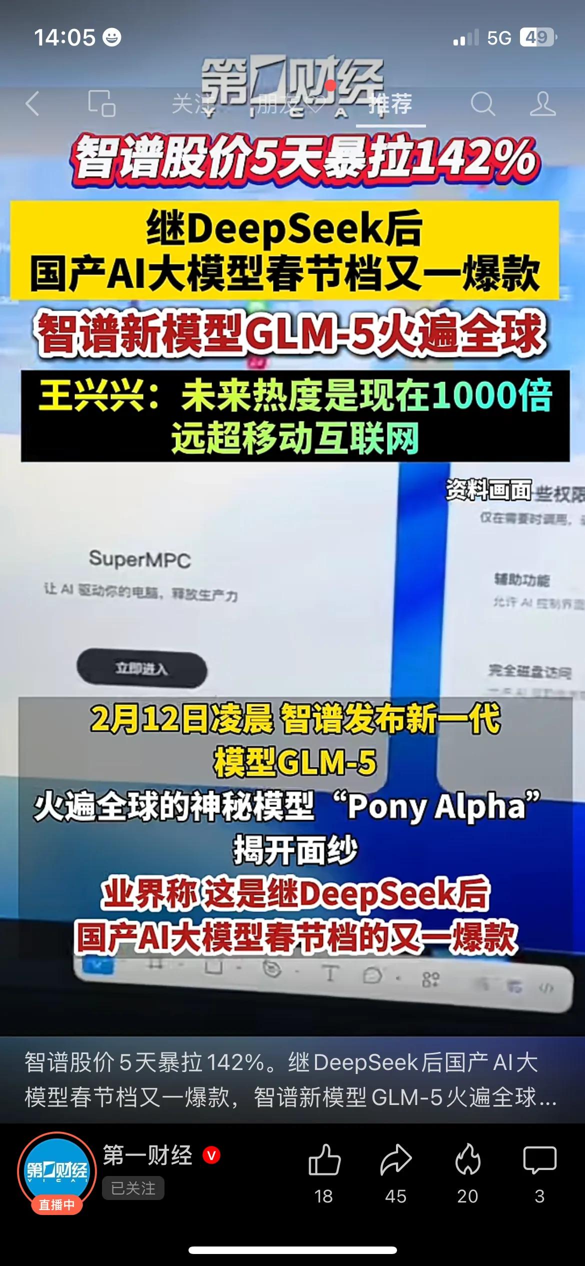 导火索很明确:2月12日凌晨,智谱正式发布新一代大模型GLM-5,也就是此前在全球圈粉无数的Pony Alpha。这款模型一亮相,直接被业内定为继DeepSeek之后,国产AI春节档的又一现象级产品。