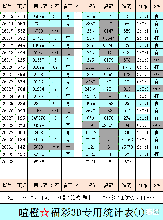 26033期:暄橙福彩3D综合条件(本期将在2月2日21:15开)一、上期回顾 ☆1、上期开奖号:4 5 2。2、和值= 11,跨度= 3。3、常态组六,122路组合。4、热度分布(热:温:冷)1:1:1。二、本期条件 ☆1、三期缺码:06789。2、热:0124,温:39,冷:5678。3、断组分解式:0459//123-678。4、四胆:1248;三胆:128。三、术语解释 ☆1、三期缺码:0至9这十个自然数当中,未在近三期开奖号出现的数字。2、热度(热温冷):自然数0至9,在近七期开奖号中,出现3次及3次以上的数字,称为热码;出现2次的数字,称为温码;出现1次和未出现的数字,称为冷码。某个数字在开奖号中出现几个,就按几次计算。3、断组分解式:将0至9这十个自然数,分成三组数字,从前往后依次为A组(4码)、B组(3码)、C组(3码),一般情况下,有一组数字不出码,偶尔会有两组数字不出码。A组不出码的情况相对较少。断组为主,分解为辅。4、常态组六号码:同时包含大数、小数、奇数、偶数、质数、合数的组六号码,共有72注。统计表中,简称“常态”。5、非常态组六号码:全大数、全小数、全奇数、全偶数、全质数、全合数等六种形态的组六号码,共有48注。统计表中,简称“非常”。★提醒:彩市有风险,参与须谨慎!水平有限,仅供参考!