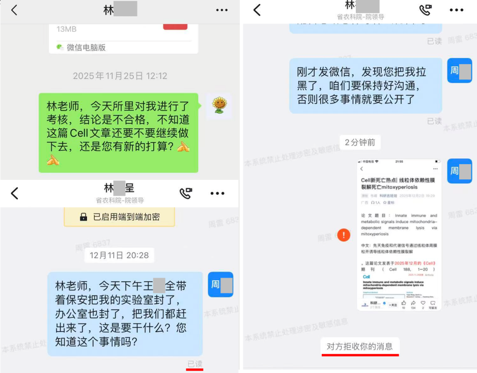周某发现重大科研进展后第一时间向院领导汇报,却遭遇消极回应,甚至被微信拉黑。随后,一系列蹊跷事件接连发生:12月初,质量营养所所长突然带人封锁其办公室和实验室,没收钥匙并注销门禁权限,未提前通知且无正当理由,封存长达25天,导致相关实验中断,关键实验材料损坏。更严重的是,在周某不在场的情况下,2台工作电脑、1台个人电脑及13块移动硬盘被取走并分散存放。