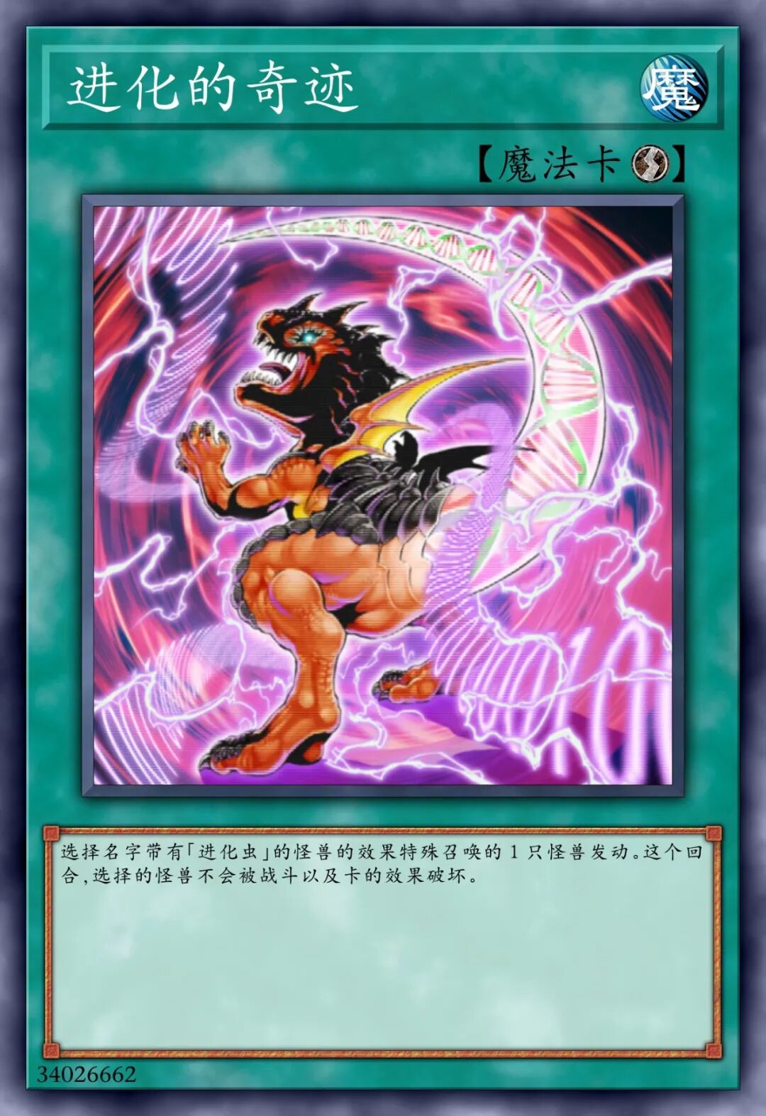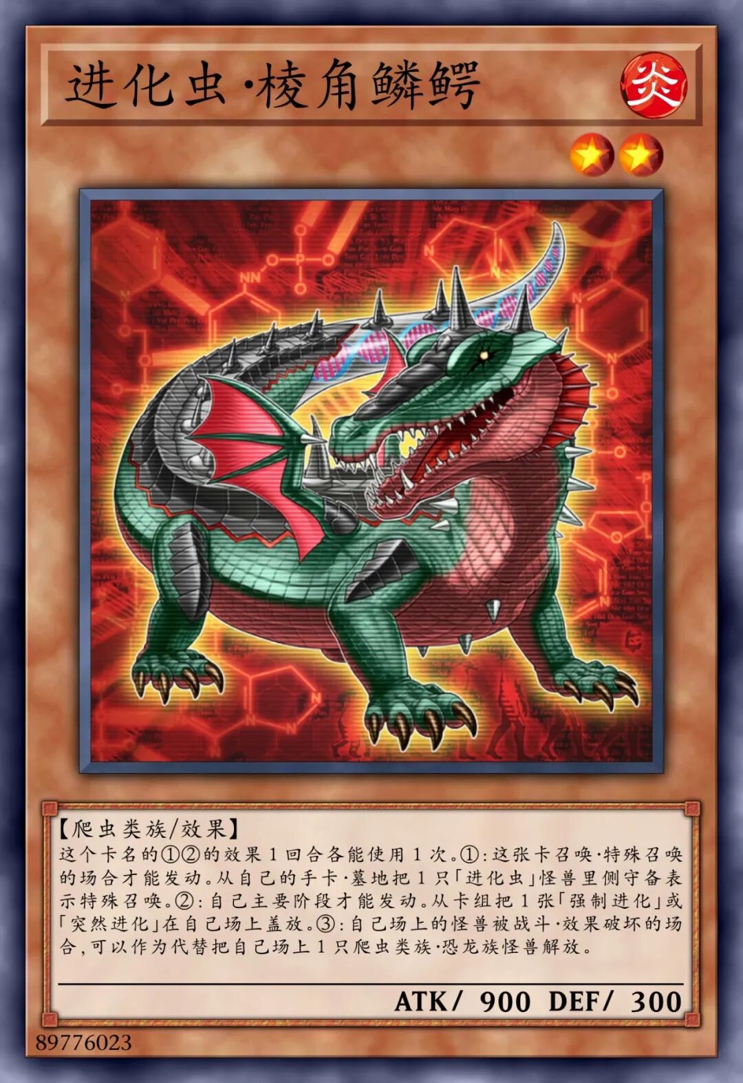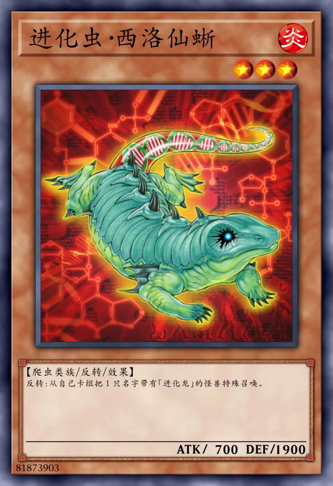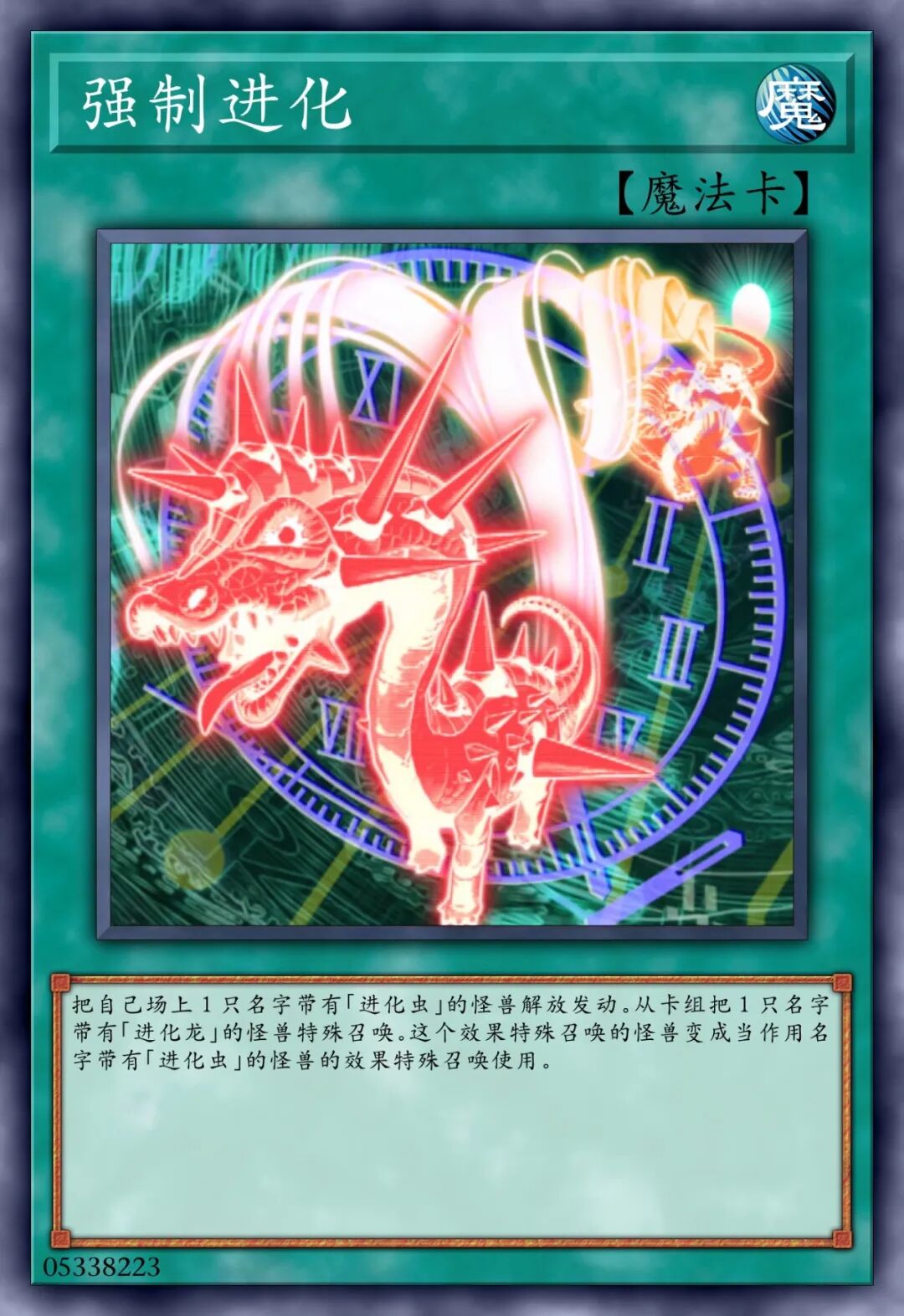 这个卡名的①②的效果1回合各可以使用1次。①:这张卡召唤•特殊召唤的场合才可以发动。从我方的手牌•墓地将1只「进化虫」怪兽里侧守备表示特殊召唤。②:我方主要阶段才可以发动。从卡组将1张「强制进化」或「突然进化」在我方场上盖放。③:我方场上的怪兽被战斗•效果破坏的场合,可以作为代替将我方场上1只爬虫类族•恐龙族怪兽解放。