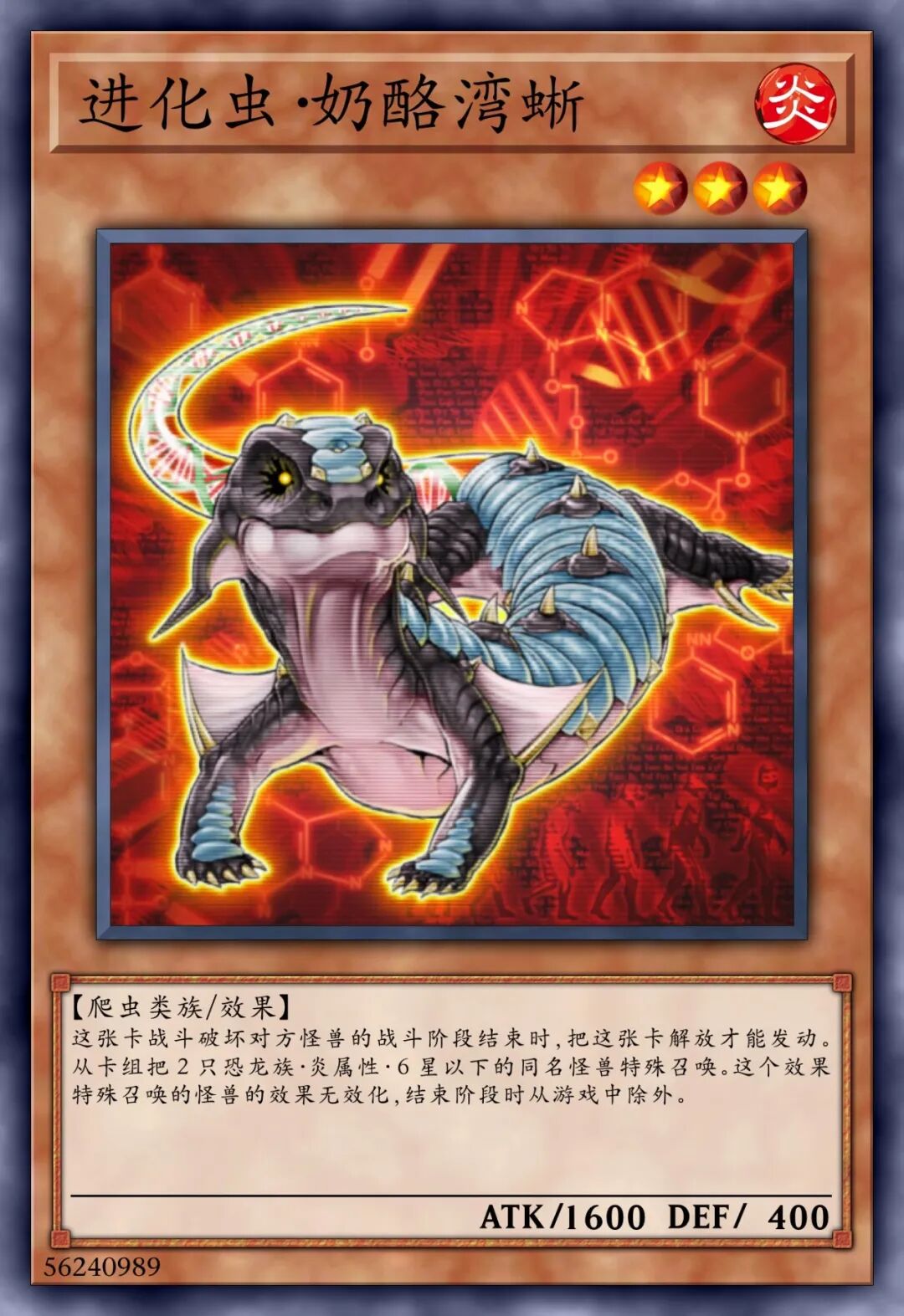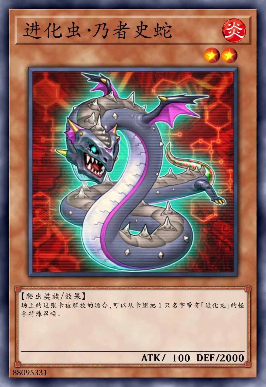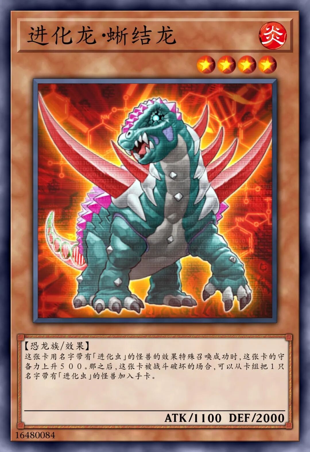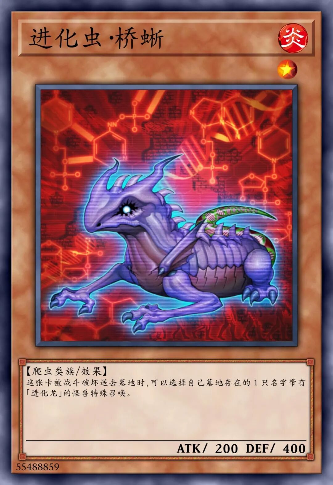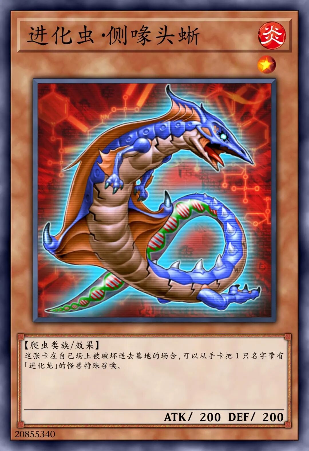 这个卡名的①②的效果1回合各可以使用1次。①:这张卡召唤•特殊召唤的场合才可以发动。从我方的手牌•墓地将1只「进化虫」怪兽里侧守备表示特殊召唤。②:我方主要阶段才可以发动。从卡组将1张「强制进化」或「突然进化」在我方场上盖放。③:我方场上的怪兽被战斗•效果破坏的场合,可以作为代替将我方场上1只爬虫类族•恐龙族怪兽解放。