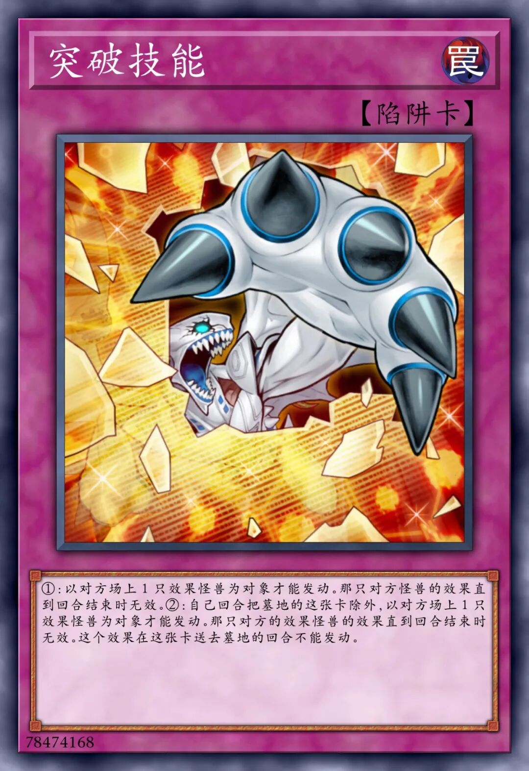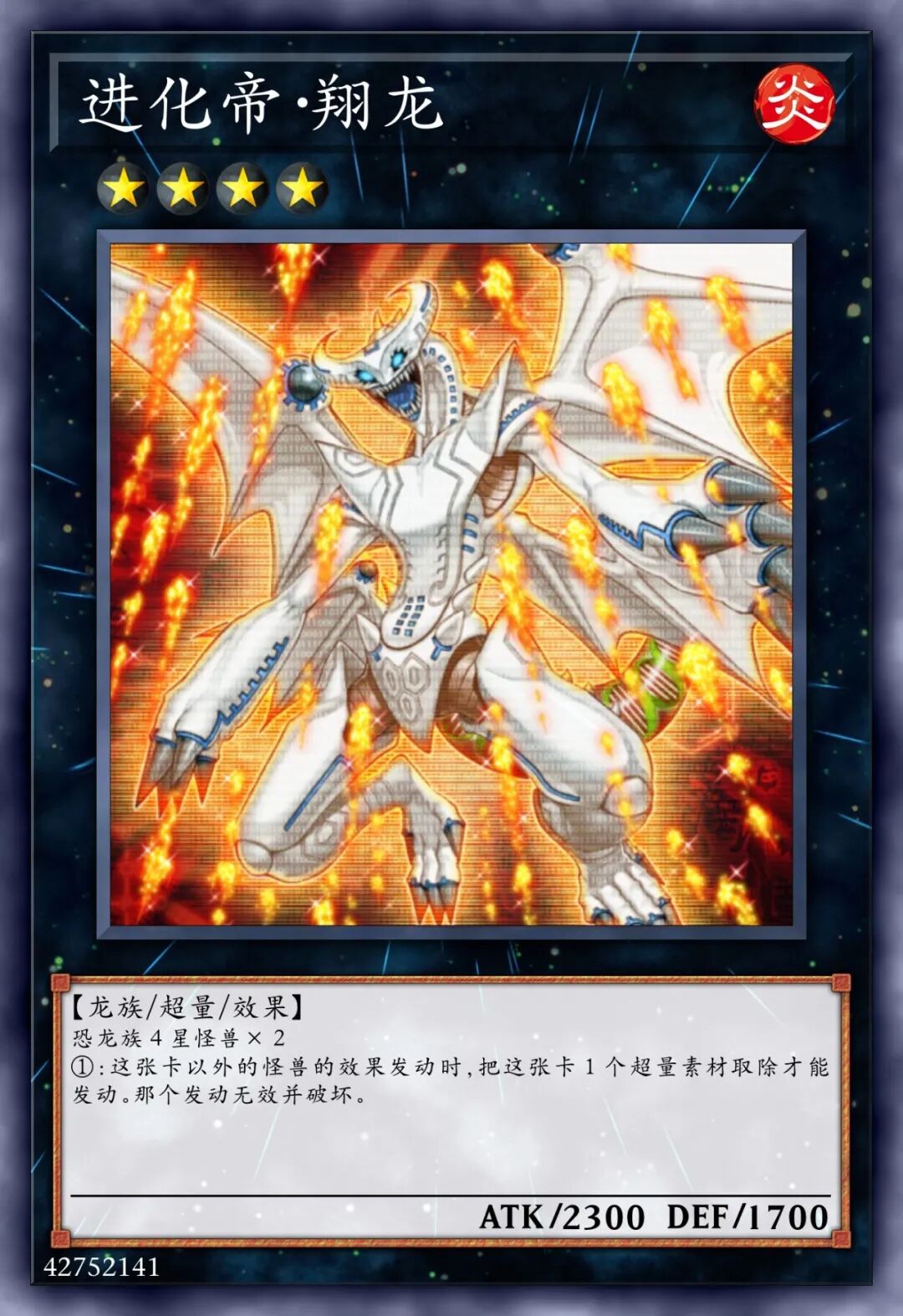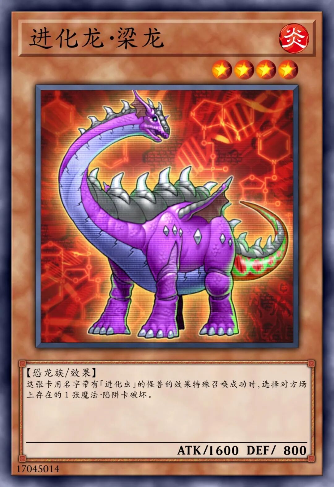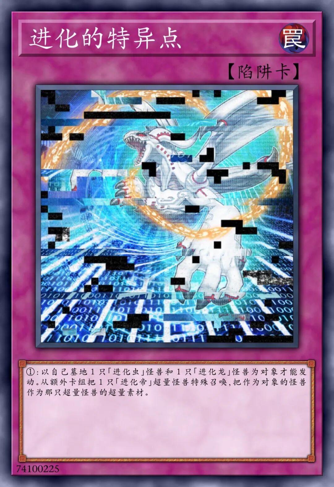 ①:对手不可以将持有超量素材的这张卡作怪兽的效果的对象。②:对手将卡的效果发动时,将这张卡2个超量素材取除,以对手场上1张表侧表示卡对象才可以发动(这张卡只有爬虫类族•恐龙族怪兽在作为超量素材的场合,取除的超量素材数量可以变成1个)。那张卡的效果直到回合结束时无效。