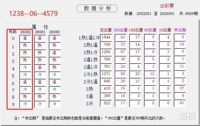 26082期:暄橙福彩3D综合条件(本期将在4月2日21:15开)一、上期回顾 ☆1、上期开奖号:8 2 7。2、和值= 17,跨度= 6。3、常态组六,122路组合。4、热度分布(热:温:冷)2:0:1。二、本期条件 ☆1、三期缺码:14569。2、热:1238,温:06,冷:4579。3、断组分解式:3489//012-567。4、四胆:3458;三胆:458。三、术语解释 ☆1、三期缺码:0至9这十个自然数当中,未在近三期开奖号出现的数字。2、热度(热温冷):自然数0至9,在近七期开奖号中,出现3次及3次以上的数字,称为热码;出现2次的数字,称为温码;出现1次和未出现的数字,称为冷码。某个数字在开奖号中出现几个,就按几次计算。3、断组分解式:将0至9这十个自然数,分成三组数字,从前往后依次为A组(4码)、B组(3码)、C组(3码),一般情况下,有一组数字不出码,偶尔会有两组数字不出码。A组不出码的情况相对较少。断组为主,分解为辅。4、常态组六号码:同时包含大数、小数、奇数、偶数、质数、合数的组六号码,共有72注。统计表中,简称“常态”。5、非常态组六号码:全大数、全小数、全奇数、全偶数、全质数、全合数等六种形态的组六号码,共有48注。统计表中,简称“非常”。★提醒:彩市有风险,参与须谨慎!水平有限,仅供参考!