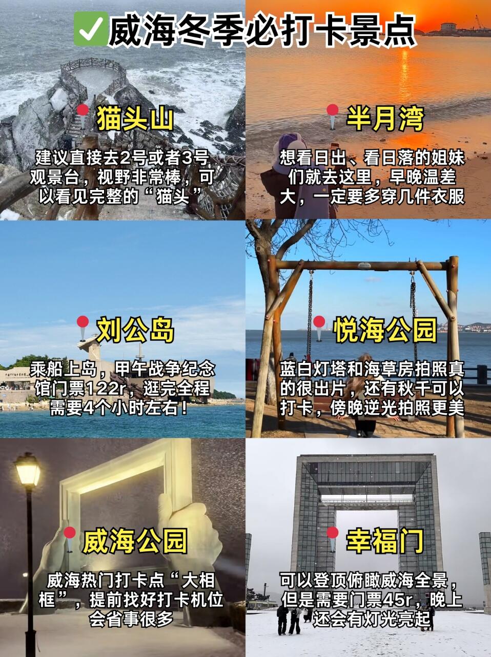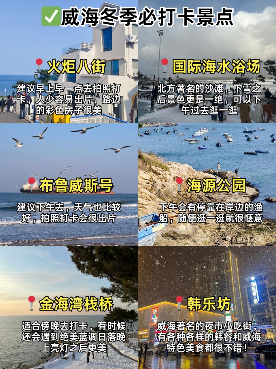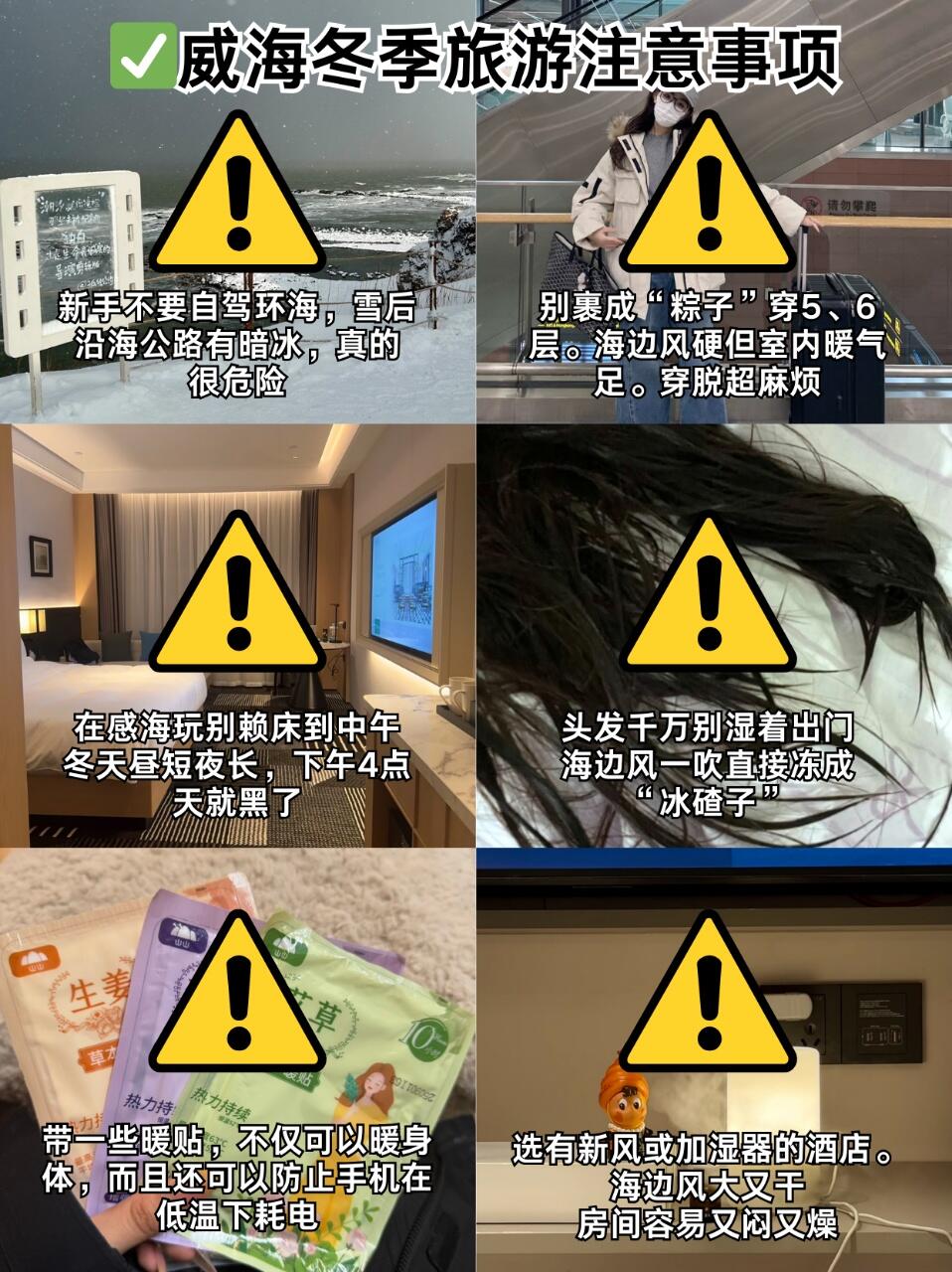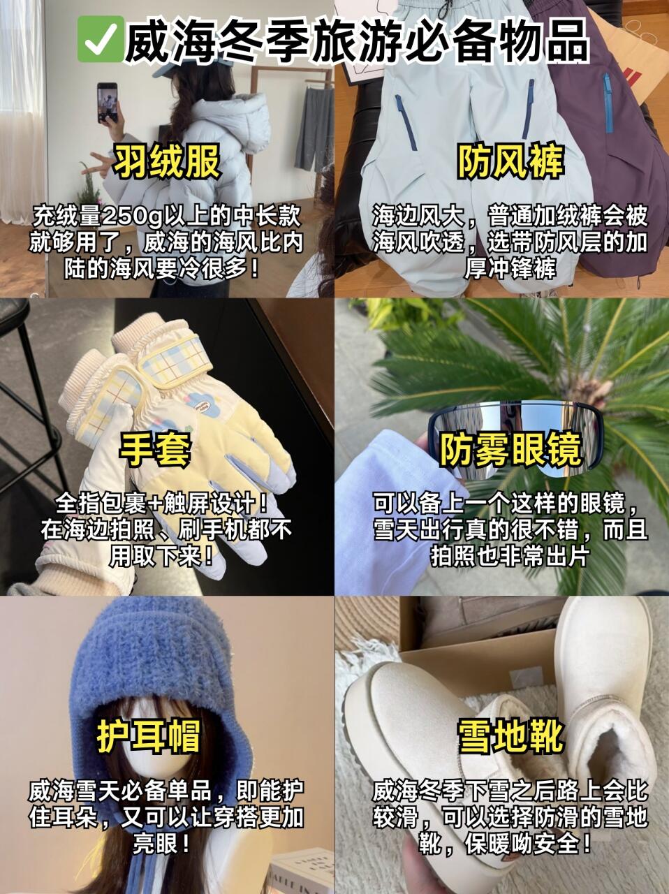 威海冬季的天气,早晚温差很大,如果去海边的话,一定要多穿几件保暖的衣物🧥,海风吹过来真的巨冷🥶,围巾🧣、帽子、手套🧤以及防滑的鞋子👟都是必备的❗还有出行前几天一定要留意好天气预报✅