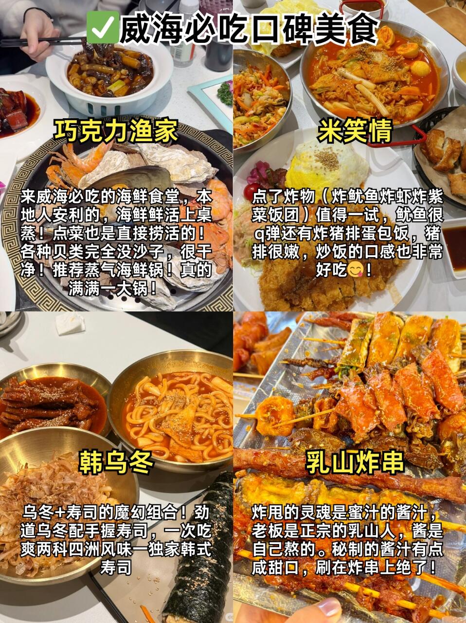 🥑巧克力渔家是威海本地人都推荐的海鲜小店‼️招牌蒸汽海鲜锅里面的海鲜都是活着现捞的,吃起来很新鲜。鲅鱼水饺🥟皮薄馅儿大,汁水很足!还有其他菜品也都很不错✅!想吃韩餐可以选择✅韩乌冬或者✅米笑情,这两家都是比较经典的韩餐,味道也都很好吃😋!如果去乳山的话一定要尝一尝✅乳山炸串真的超好吃!