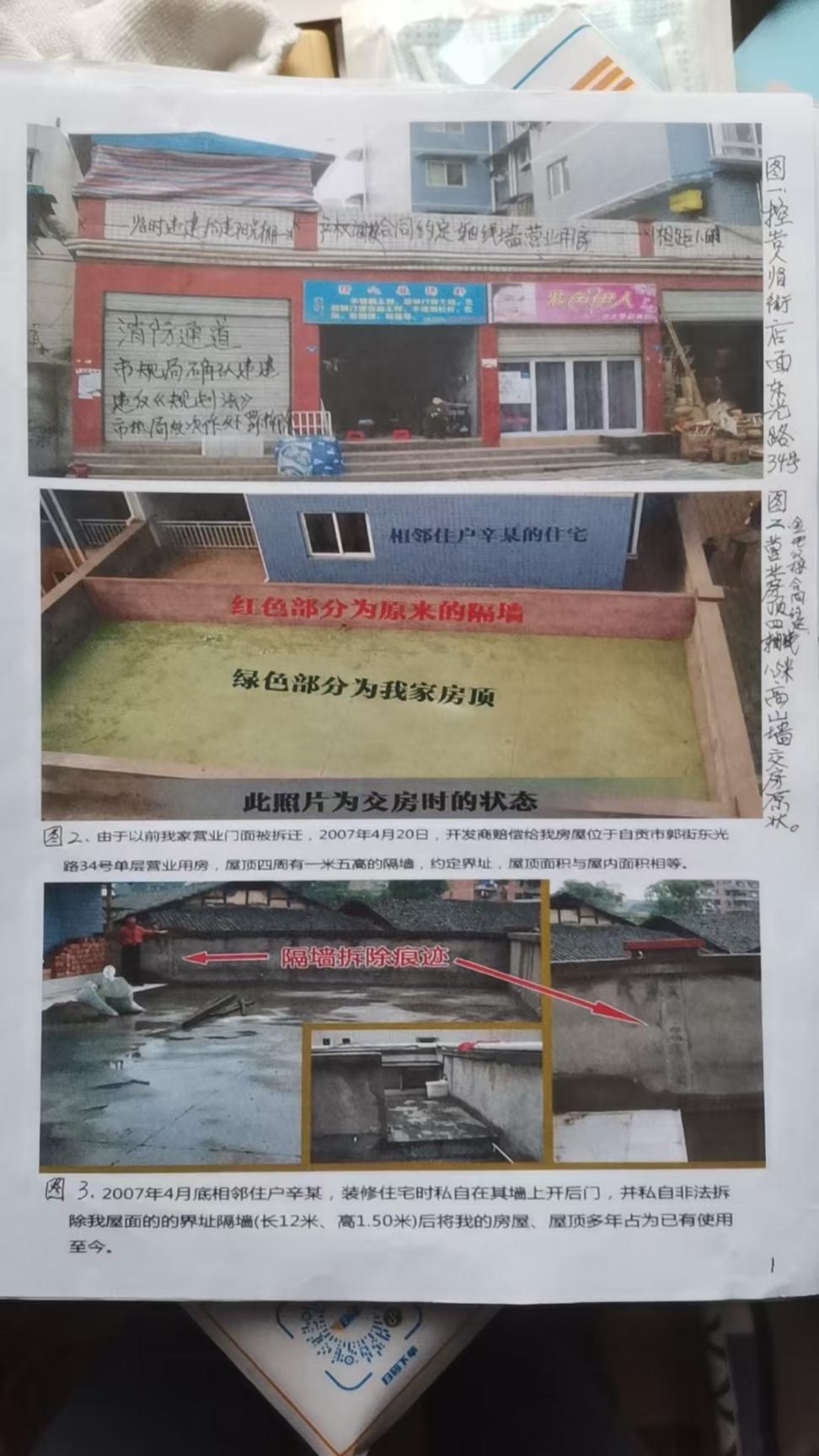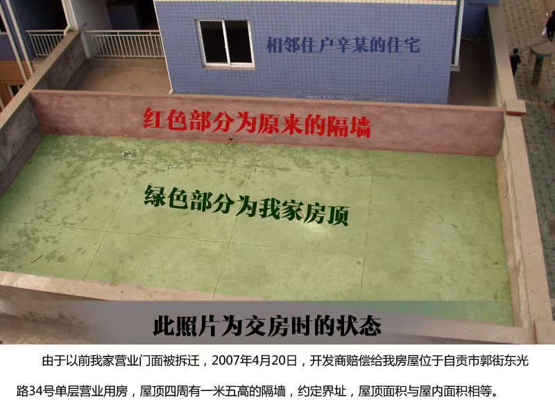 时间回溯至2006年,金地公司依托原告营业房墙壁修建65平米临时建筑(消防通道),逾期后被确认属违建。2007年4月,杨先生、周女士通过该公司拆迁安置,获得自贡市自流井区东光路34号7栋1层74.58平方米营业用房所有权。依据2007年1月11日签订的《拆迁房屋产权调换协议及补充协议》,房屋按轴线分割(三方独壁、一方共壁),交房时房顶四周轴线建有1.5米高山墙以明确产权管理使用权益(无通道进入房顶),屋顶面积与房屋建筑面积一致,依法完成登记并由自贡市房管局颁发《房屋所有权证》,这本是一家人安稳生活的根基。