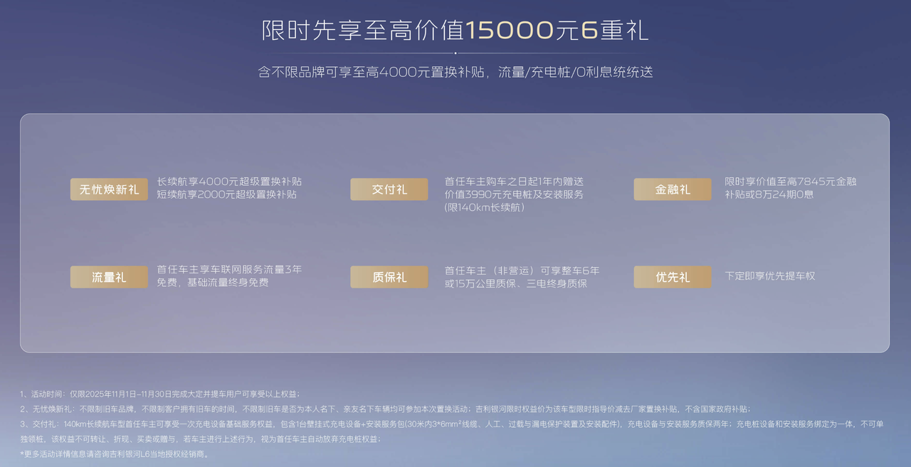 价格方面,吉利银河 L6 EM-i 也很有诚意,2025年11月1日-11月30日完成大定并提车的用户可享受7.78万元的限时权益价,以及一系列的购车权益。