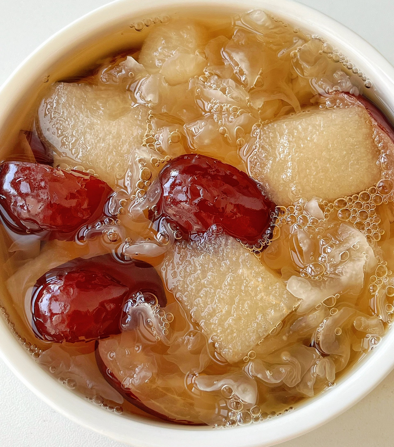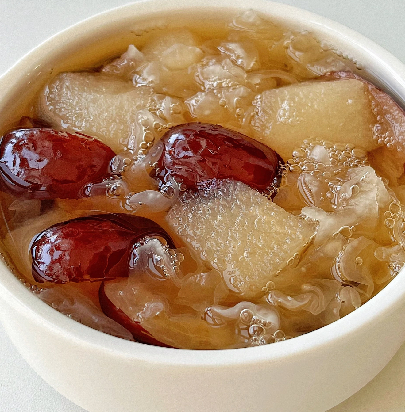 后来,她去一位老中医家里做客。老中医看她气色不好,就给她推荐了这道雪梨银耳润颜羹。闺蜜抱着试试看的心态,坚持喝了一段时间。嘿,你还别说,这效果简直绝了!她的皮肤慢慢变得有光泽了,痘痘也少了,整个人又恢复了往日的神采。从那以后,这道润颜羹就成了她的“心头宝”,还经常做给我们这些闺蜜喝呢。
