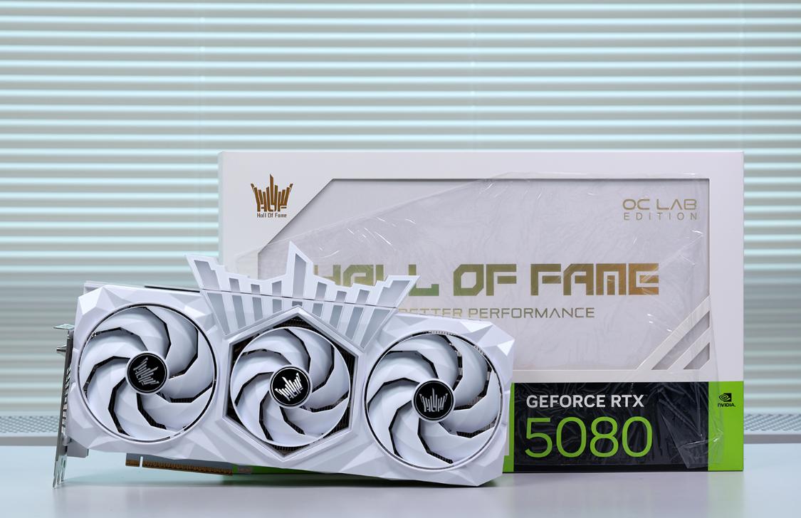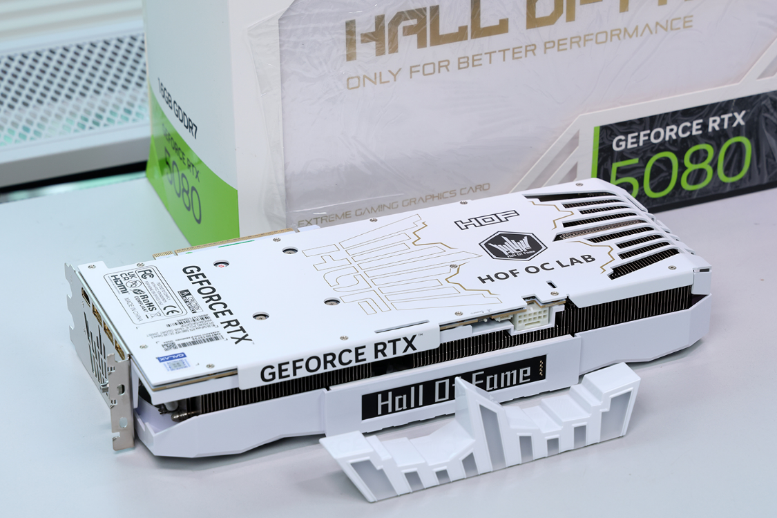 白色主题,显卡当然影驰RTX5080 HOF OC LAB Deluxe-X显卡。全白配色的显卡本体,钻石切割造型散热外壳,质感优秀。