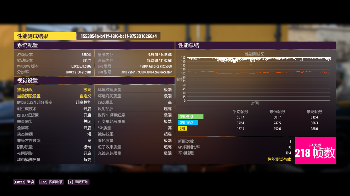 《极限竞速·地平线5》基准测试,4K分辨率下,极端画质,极端光追,开启DLSS 3.0并设为超高性能模式,游戏平均帧数218 FPS,DLSS为质量模式时,游戏平均帧数191 FPS。