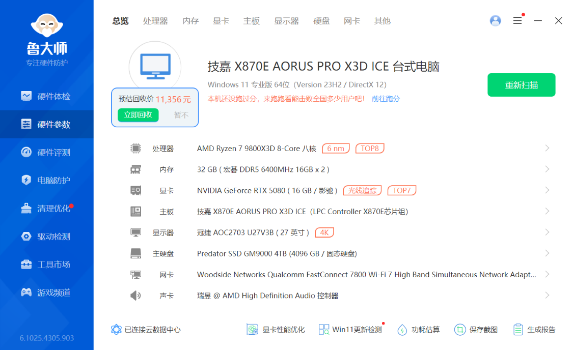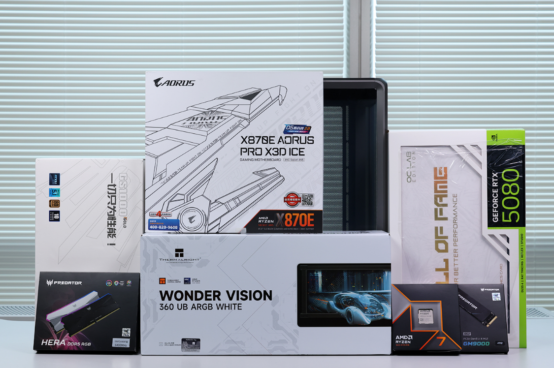 完整配置清单:AMD R7-9800X3D处理器、技嘉X870E Aorus Pro X3D ICE 电竞冰雕主板、影驰RTX 5080 HOF OC LAB Deluxe-X显卡、宏碁掠夺者Hera影锋D5-6400MT/s C30冰戟银16G*2内存、宏碁掠夺者GM9000 4T M.2固态硬盘、乔思伯D401海景房机箱、影驰HOF GS-1000 ATX3.1金牌全模组电源、利民WONDER VISION 360 UB ARGB WHITE 奇幻视界UB白色一体式水冷、影驰梦境二代散热风扇*4(3反+1正)...主流电商平台参考预算应该在2.7W左右,仅供参考。