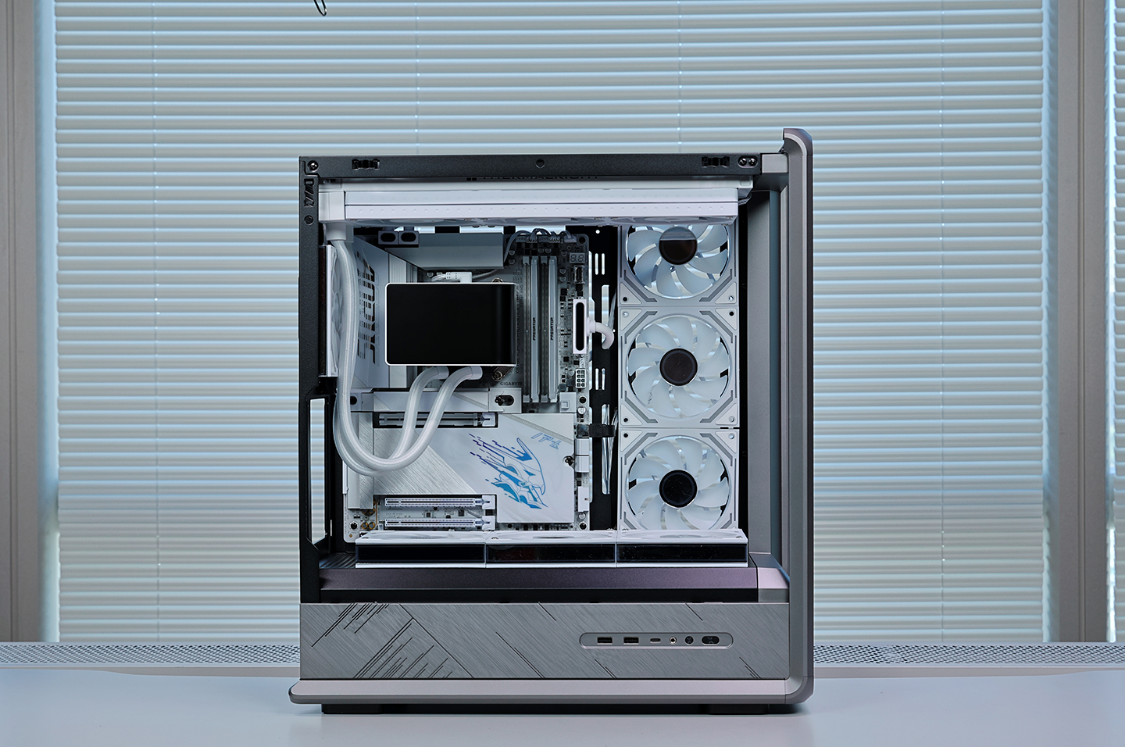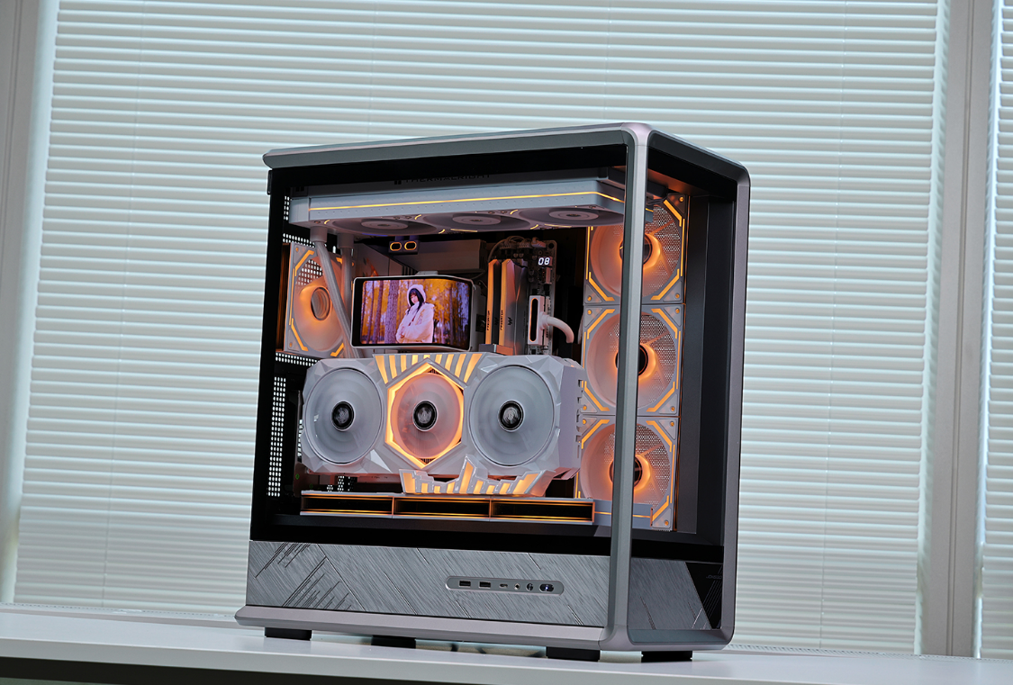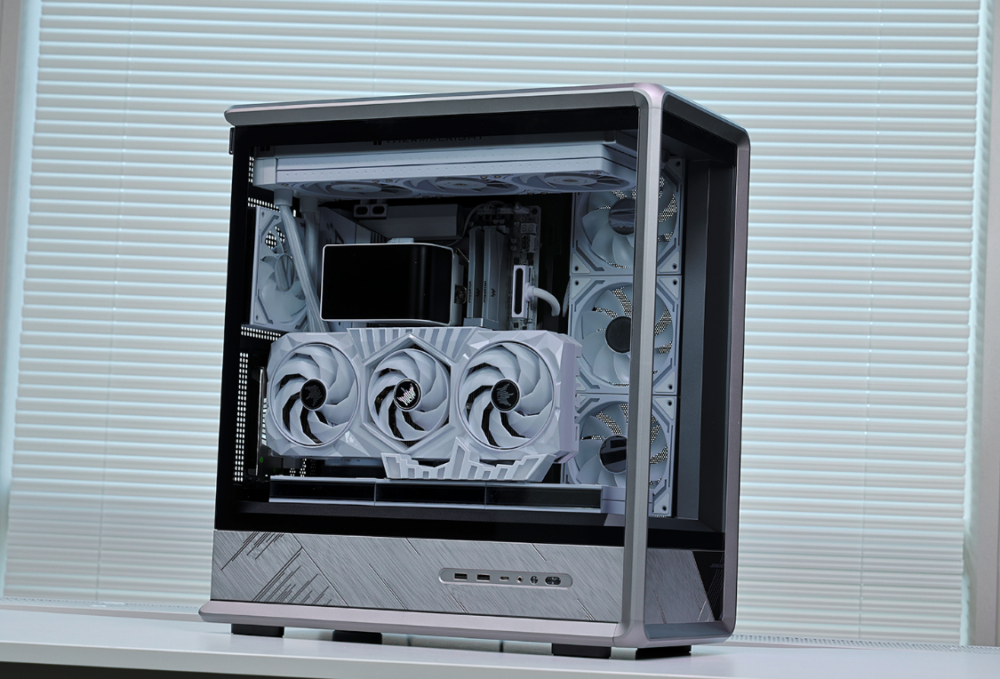3颗白色无光霜环风扇(左右102mm+中间92mm)设计,同时中间风扇边缘及顶部灯带,搭配同样搭载ARGB灯效的皇冠设计,信仰拉满。